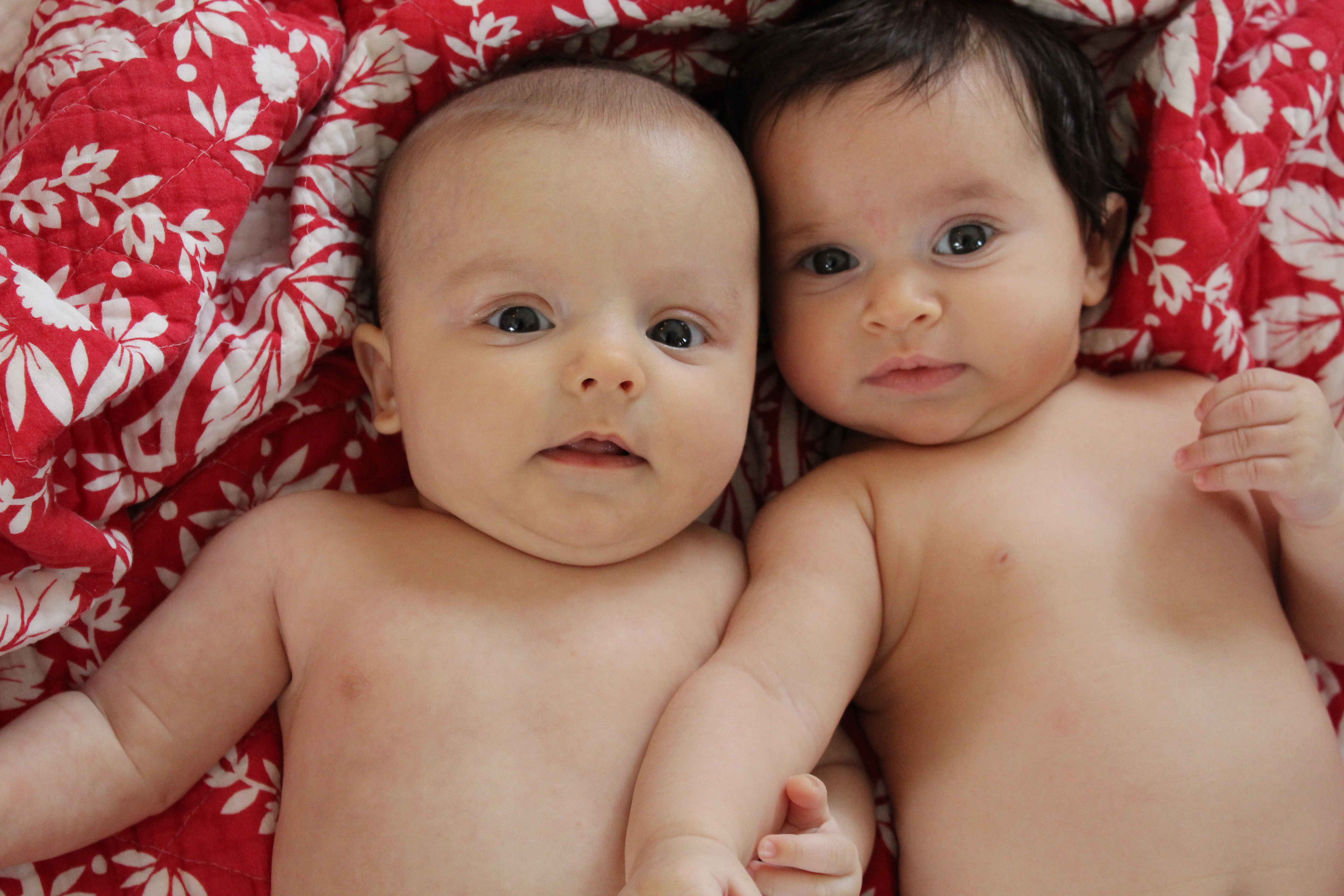 Black and white pencil drawing of two babies lying on a patterned blanket.