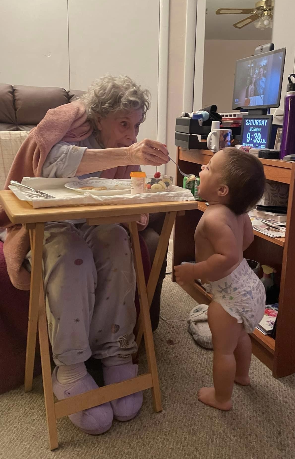Grandmother feeding baby at a table.
