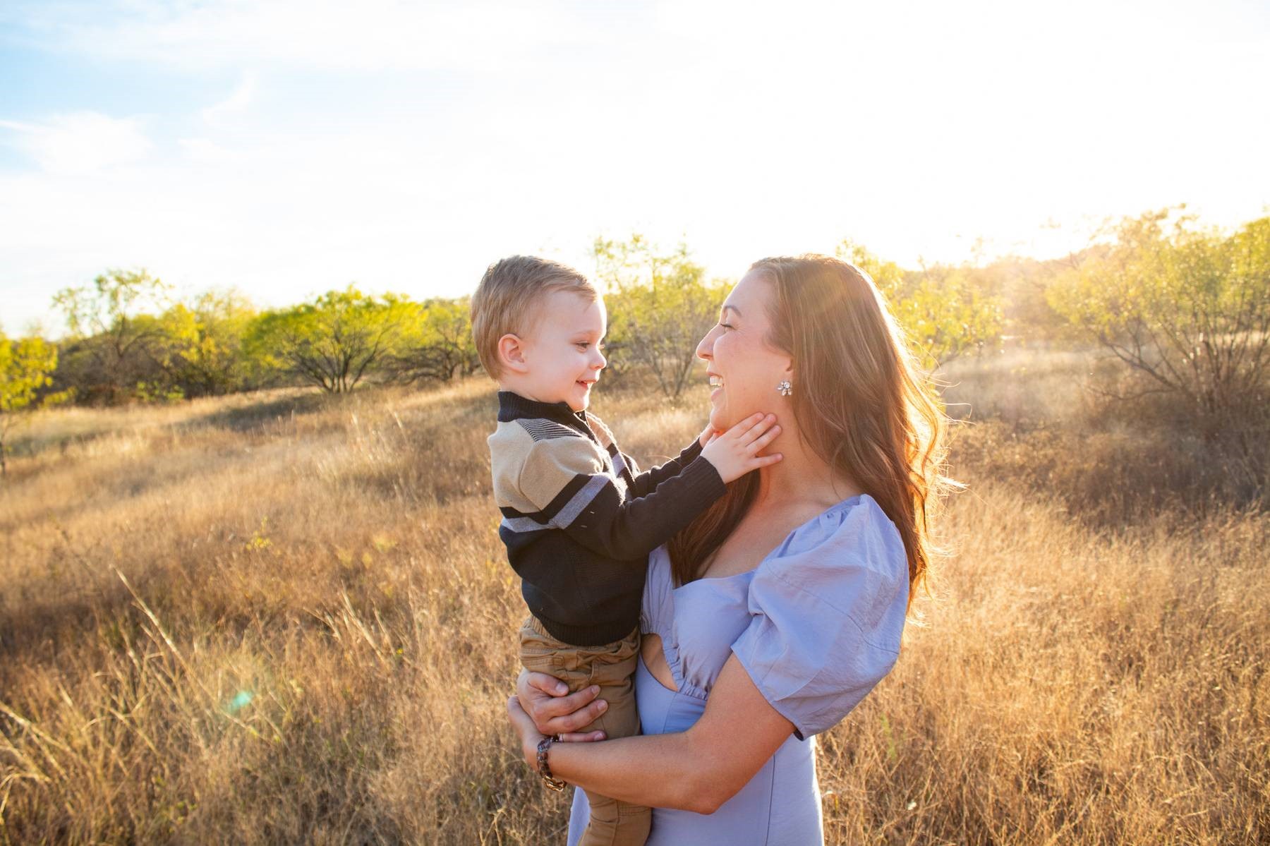 Mother and toddler smiling at each other in a field.
