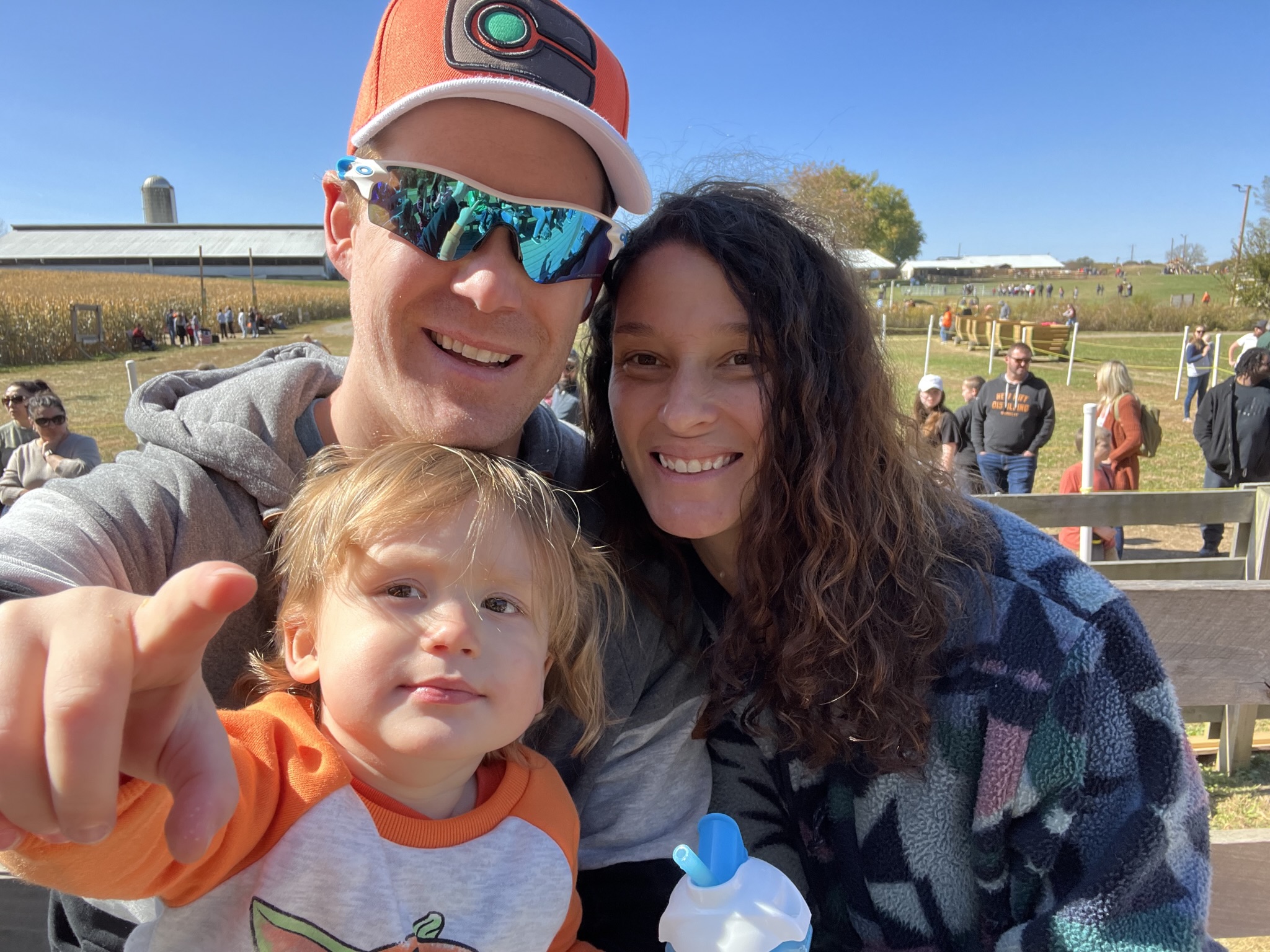 Color pencil drawing of a family selfie: a man in sunglasses and a baseball cap, a woman with long brown hair, and a toddler.