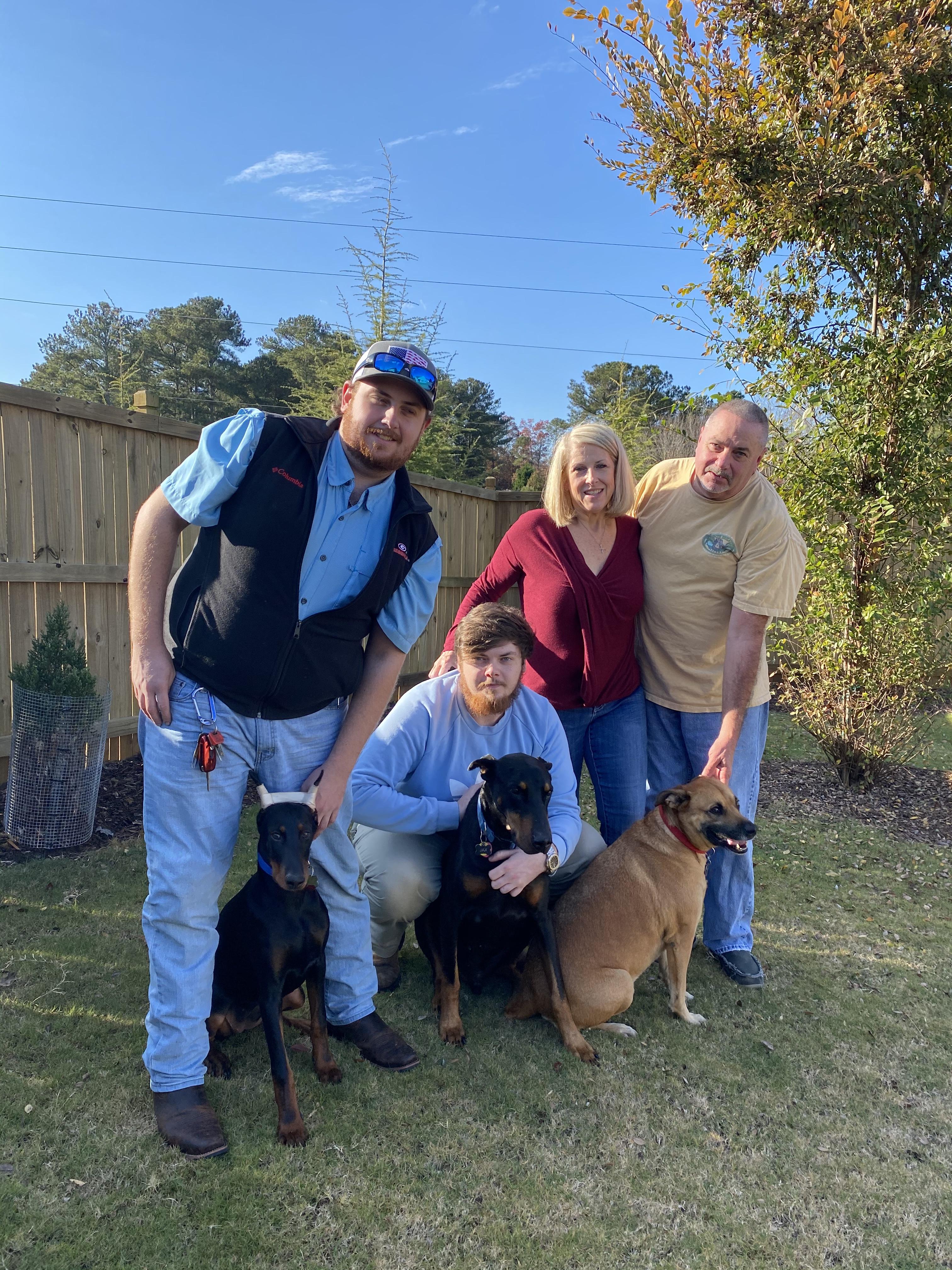 Colored pencil drawing of four Doberman Pinschers and one brown mixed-breed dog.