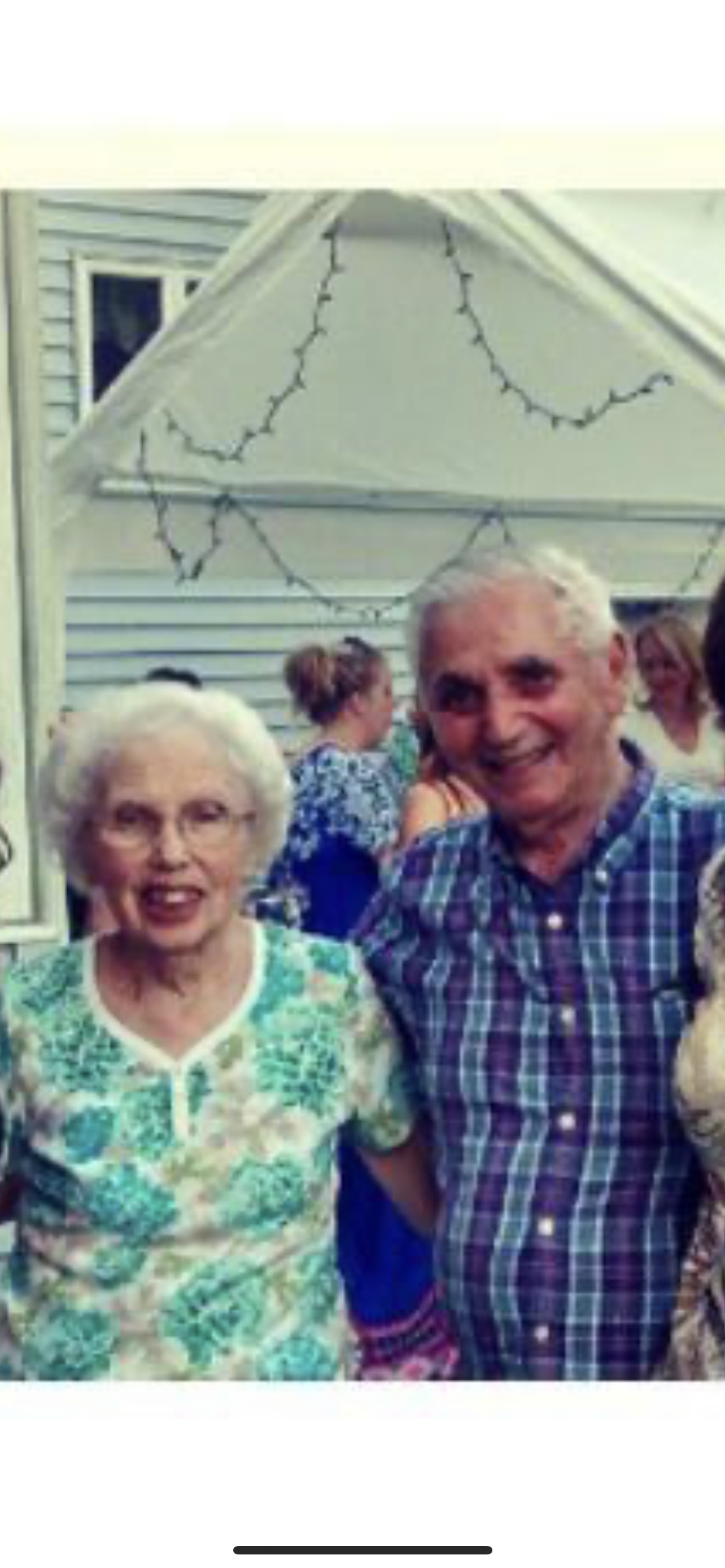 Colored pencil portrait of grandparents with a young boy and baby girl.