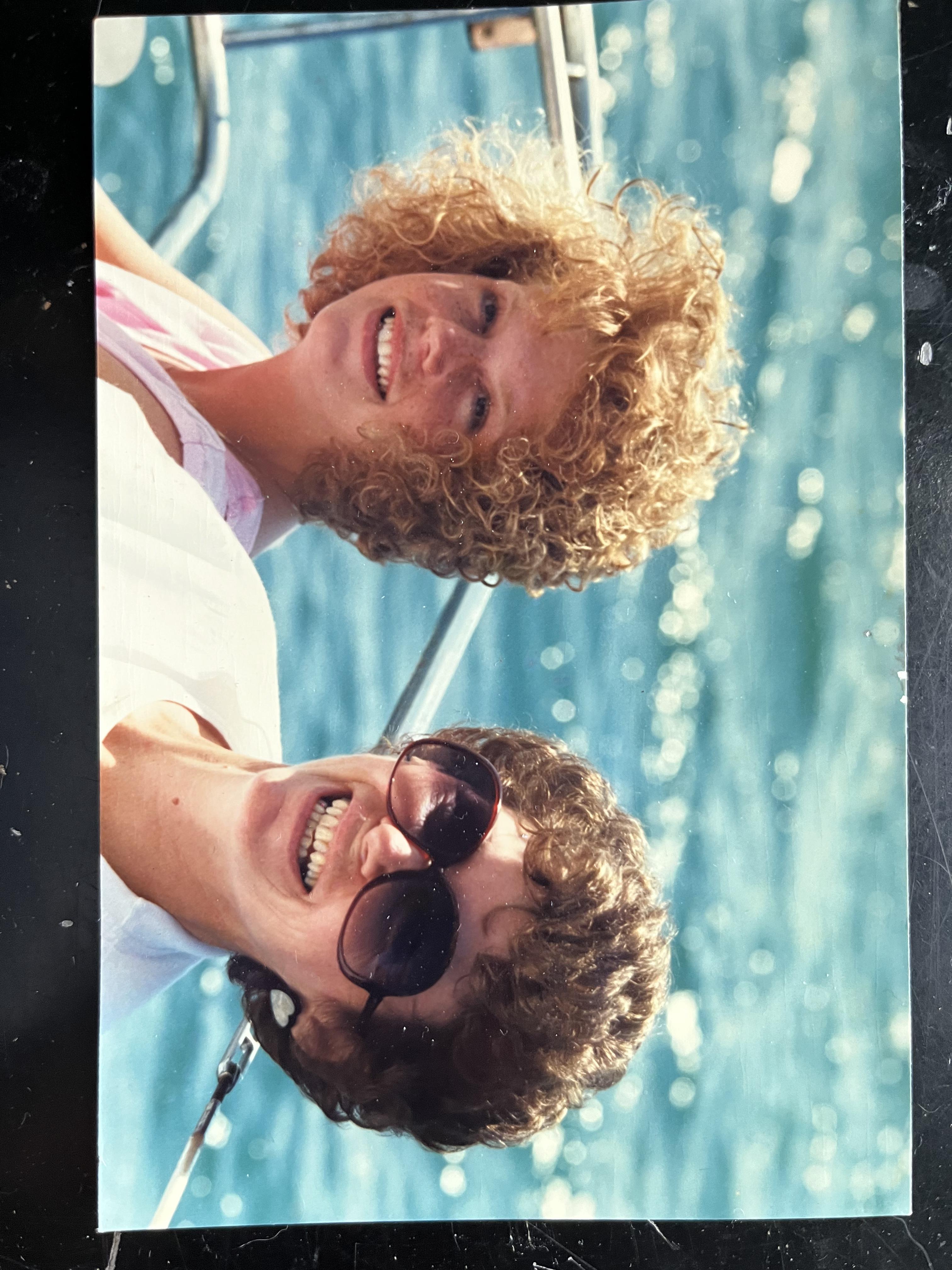 Colored pencil drawing of two smiling women on a boat.