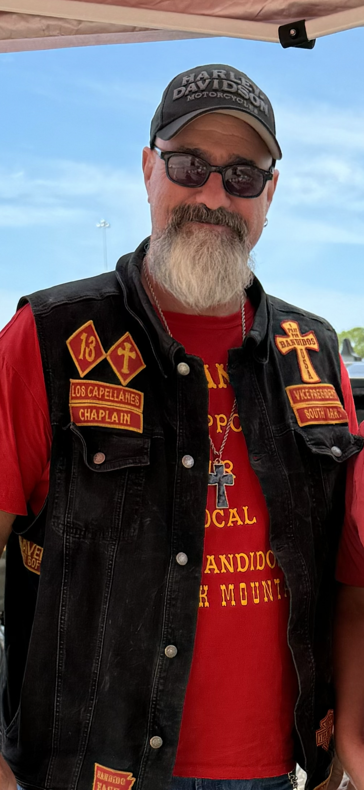 Colored pencil portrait of three people, a man in a Harley Davidson hat and vest, a man with a beard, and a woman with short hair.