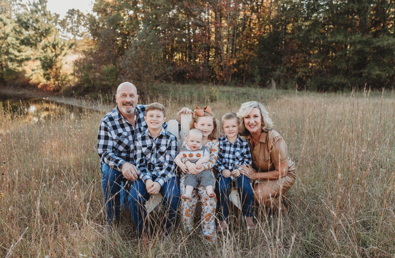 Colored pencil portrait of a family: two parents, three boys, and a girl.