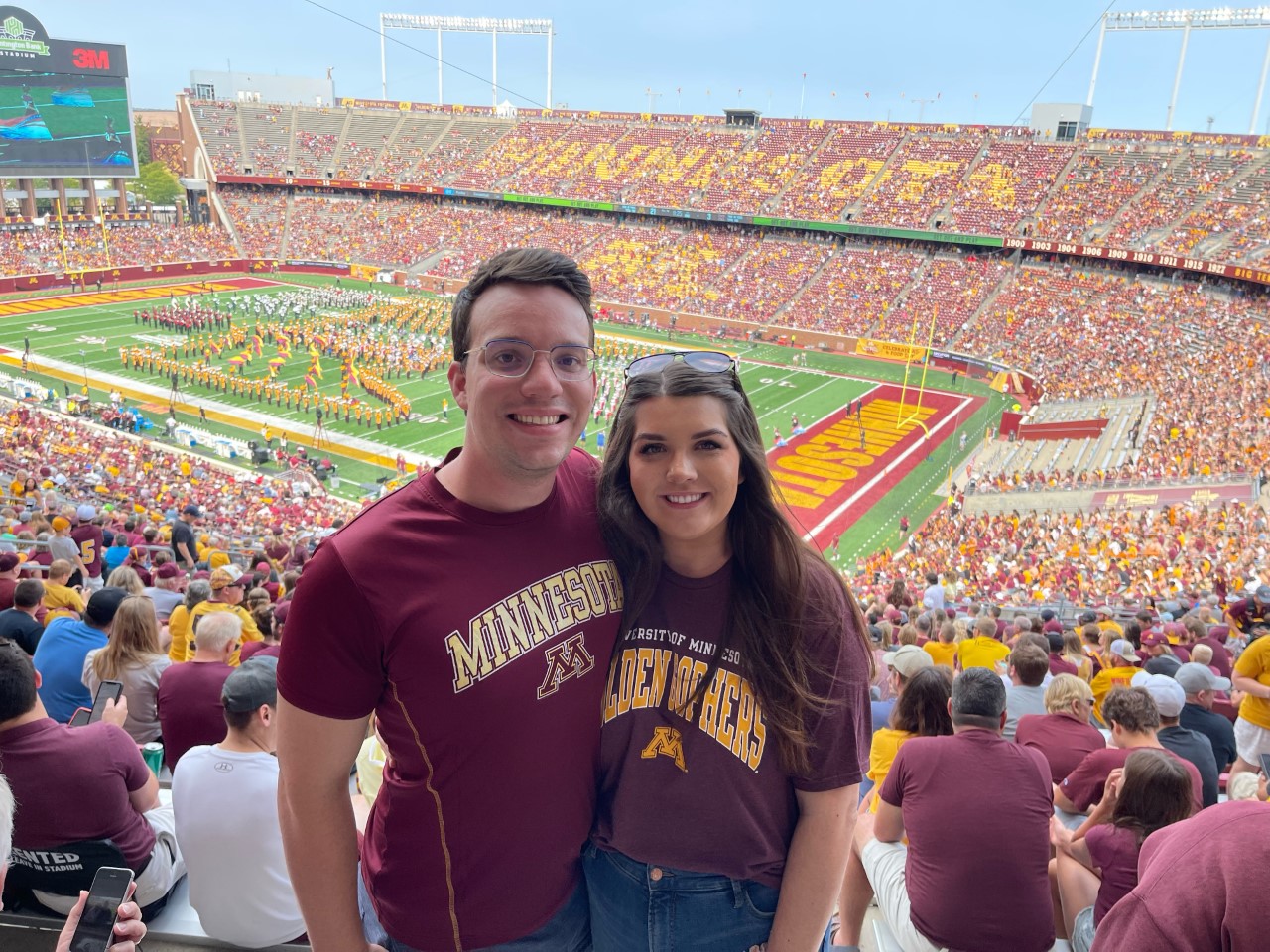 Couple in Minnesota Golden Gophers shirts at a football game.