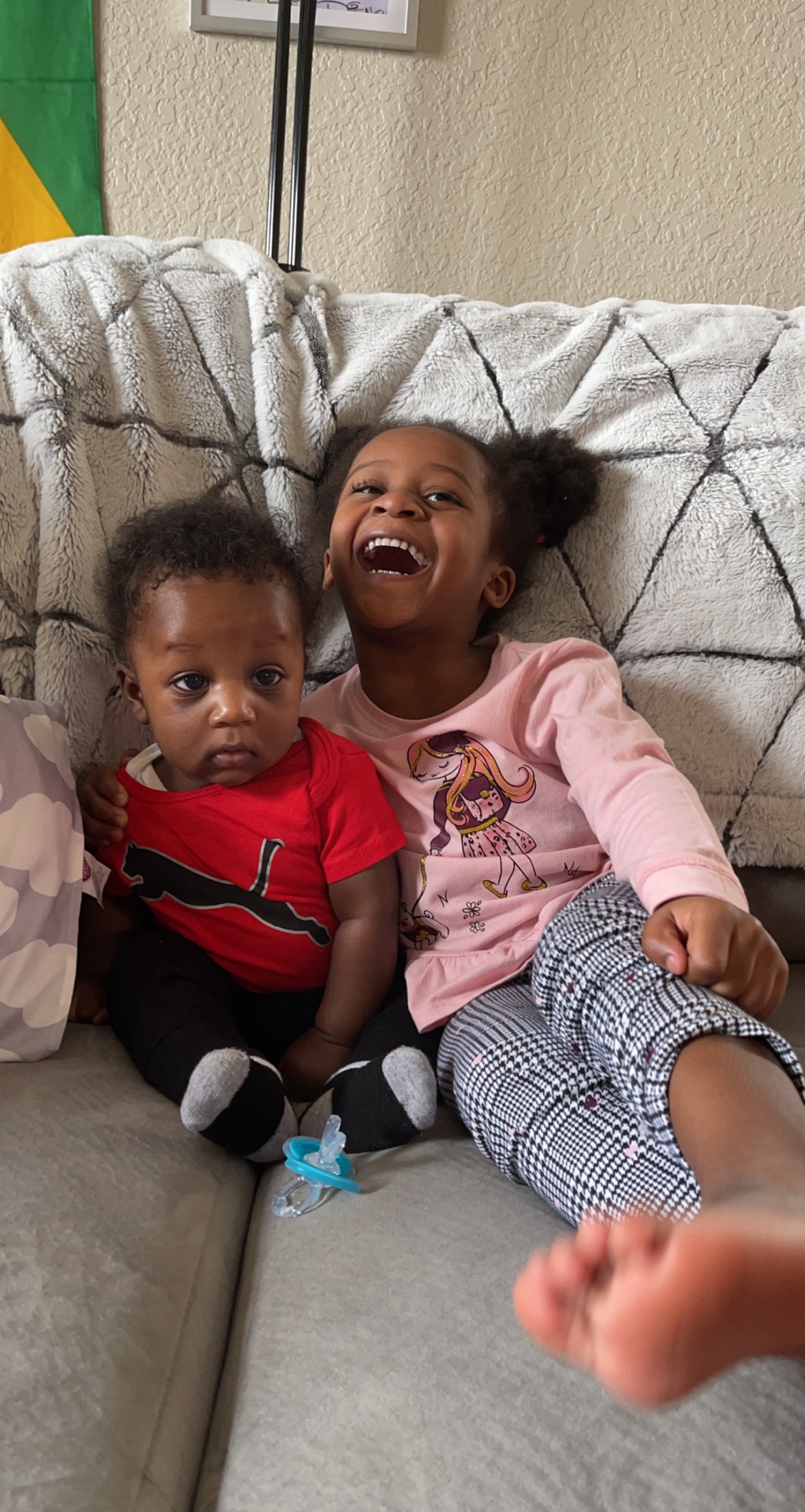 Colored pencil portrait of a man holding a baby and a laughing girl.