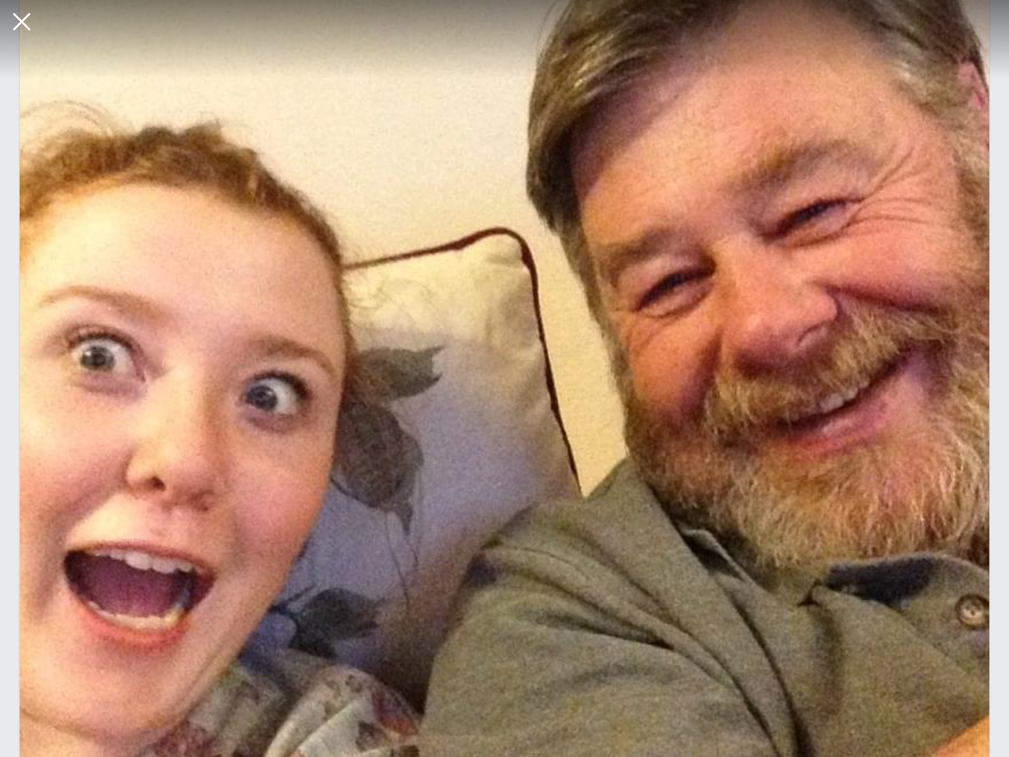 Colored pencil drawing of a surprised young woman and a smiling older man.