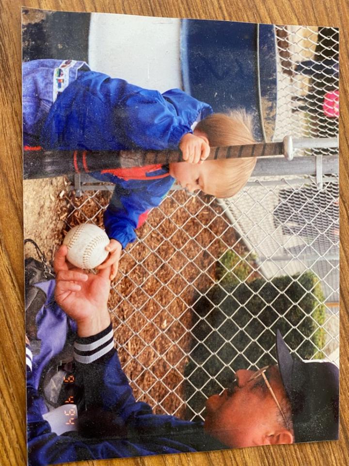 A toddler and an adult man at a baseball field, the toddler holding a bat and the man a baseball.