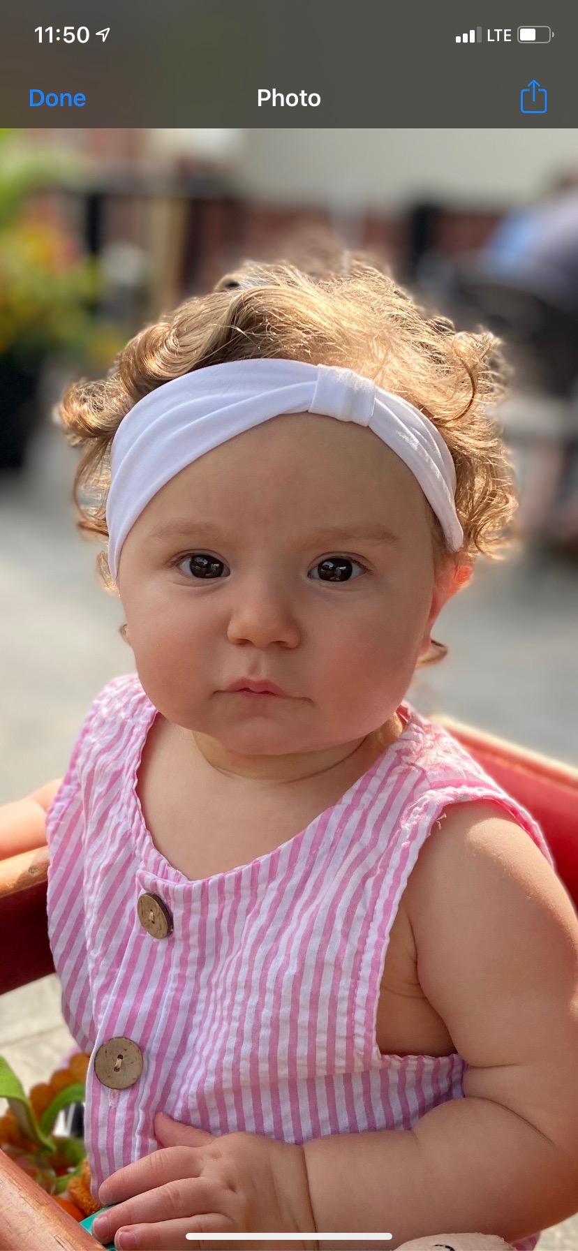 Portrait of a baby girl with blond curly hair wearing a white headband and pink striped dress.