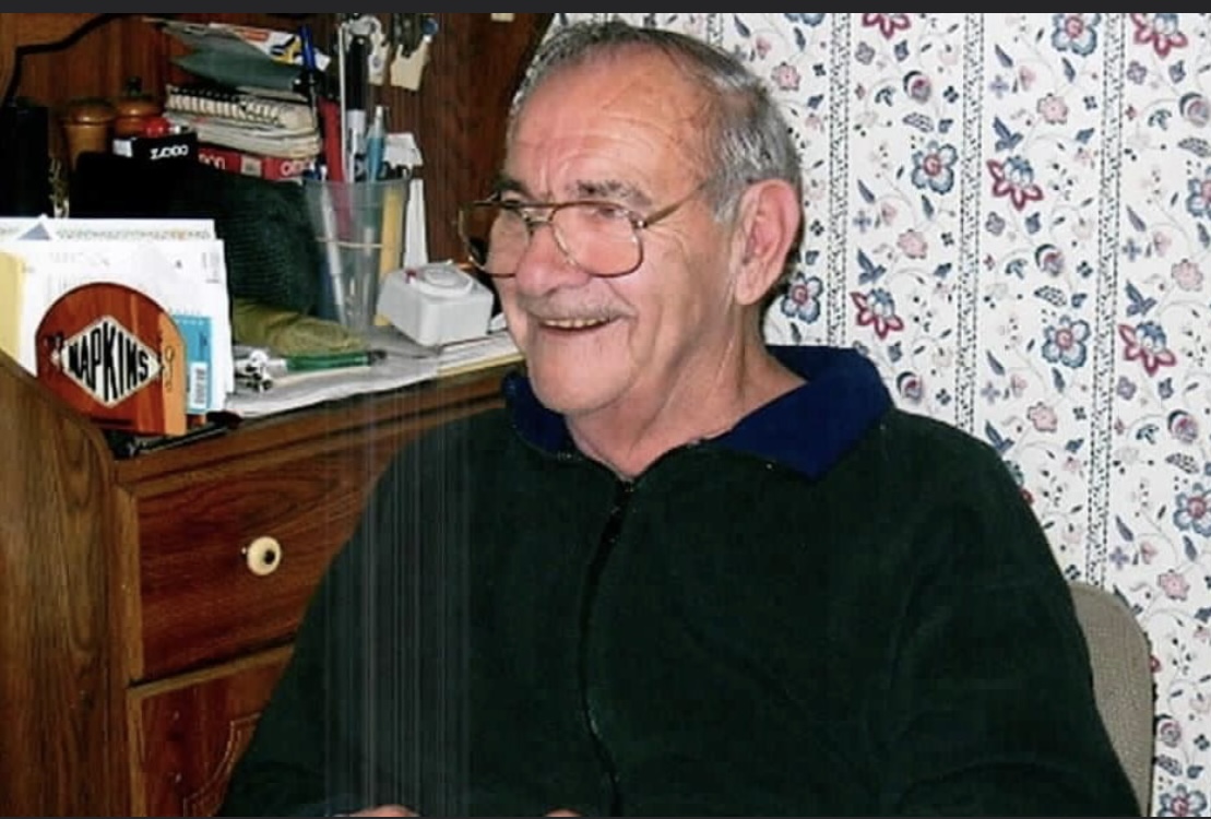 Colored pencil drawing of an elderly man in glasses holding a baby wearing a onesie with a number one and an American flag bow.