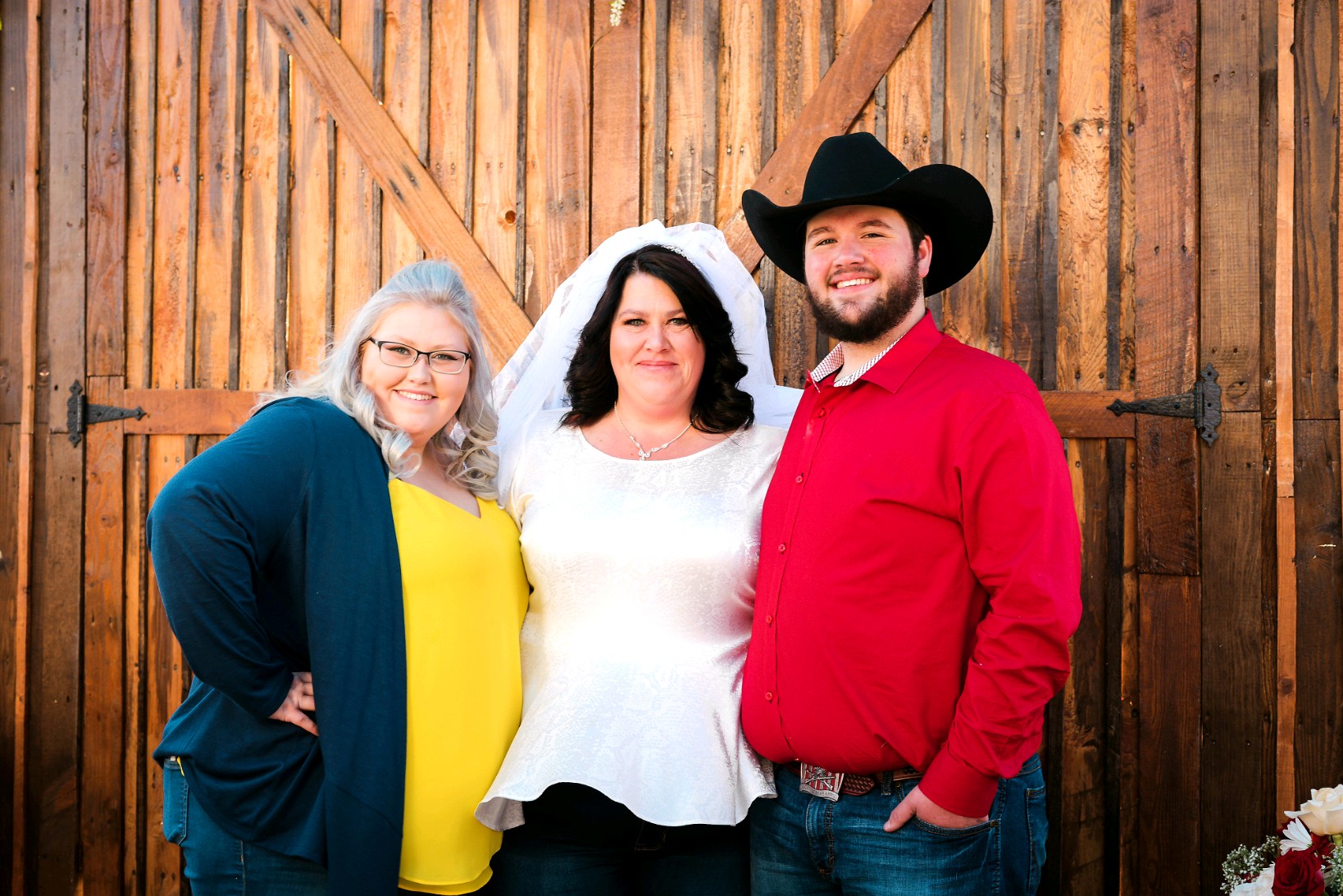 Colored pencil drawing of a bride, her sister, groom, and father-in-law.