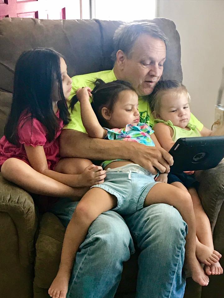 A grandfather and his three granddaughters looking at a tablet together.