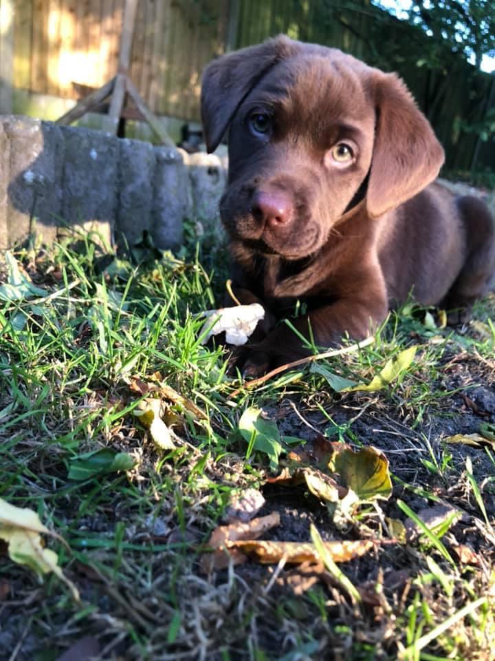 Chocolate Labrador puppy in the grass