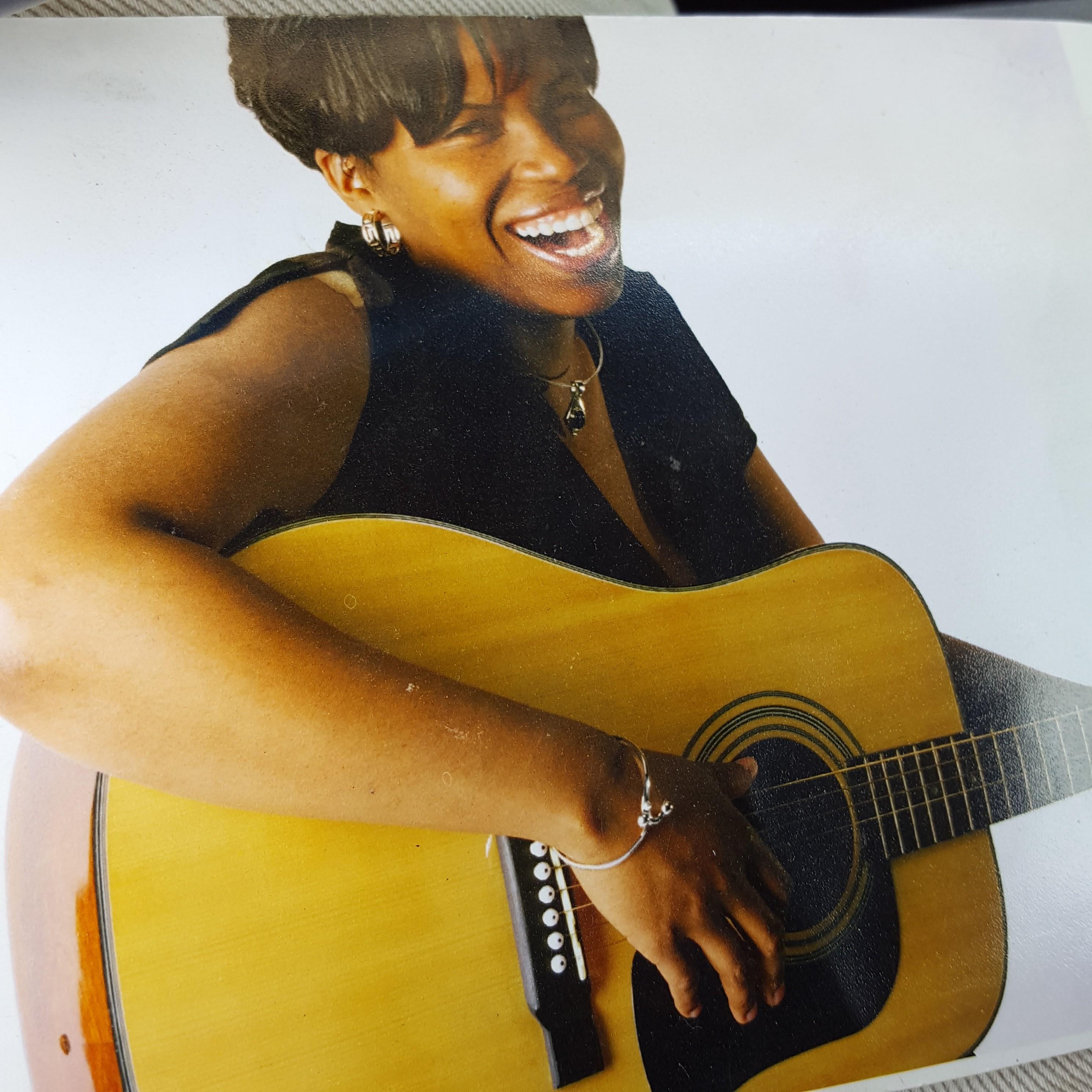 Portrait of a laughing woman with short hair, holding an acoustic guitar against a brick wall.