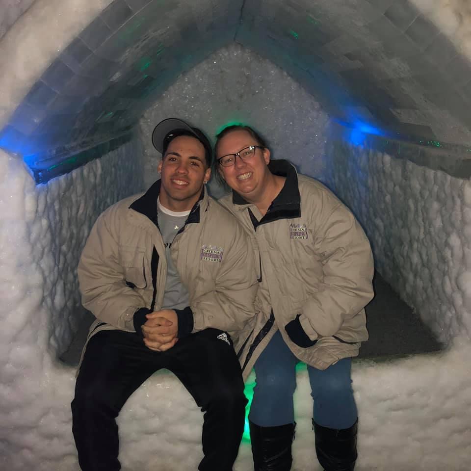 Colored pencil portrait of a woman and young boy in a park.