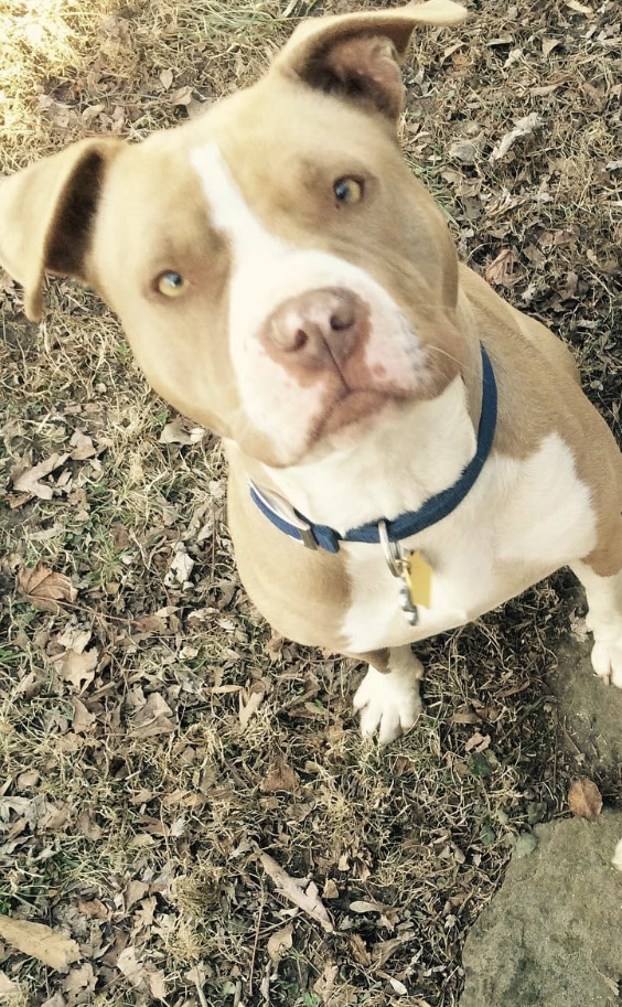Colored pencil drawing of a light brown Pit Bull wearing a blue collar.