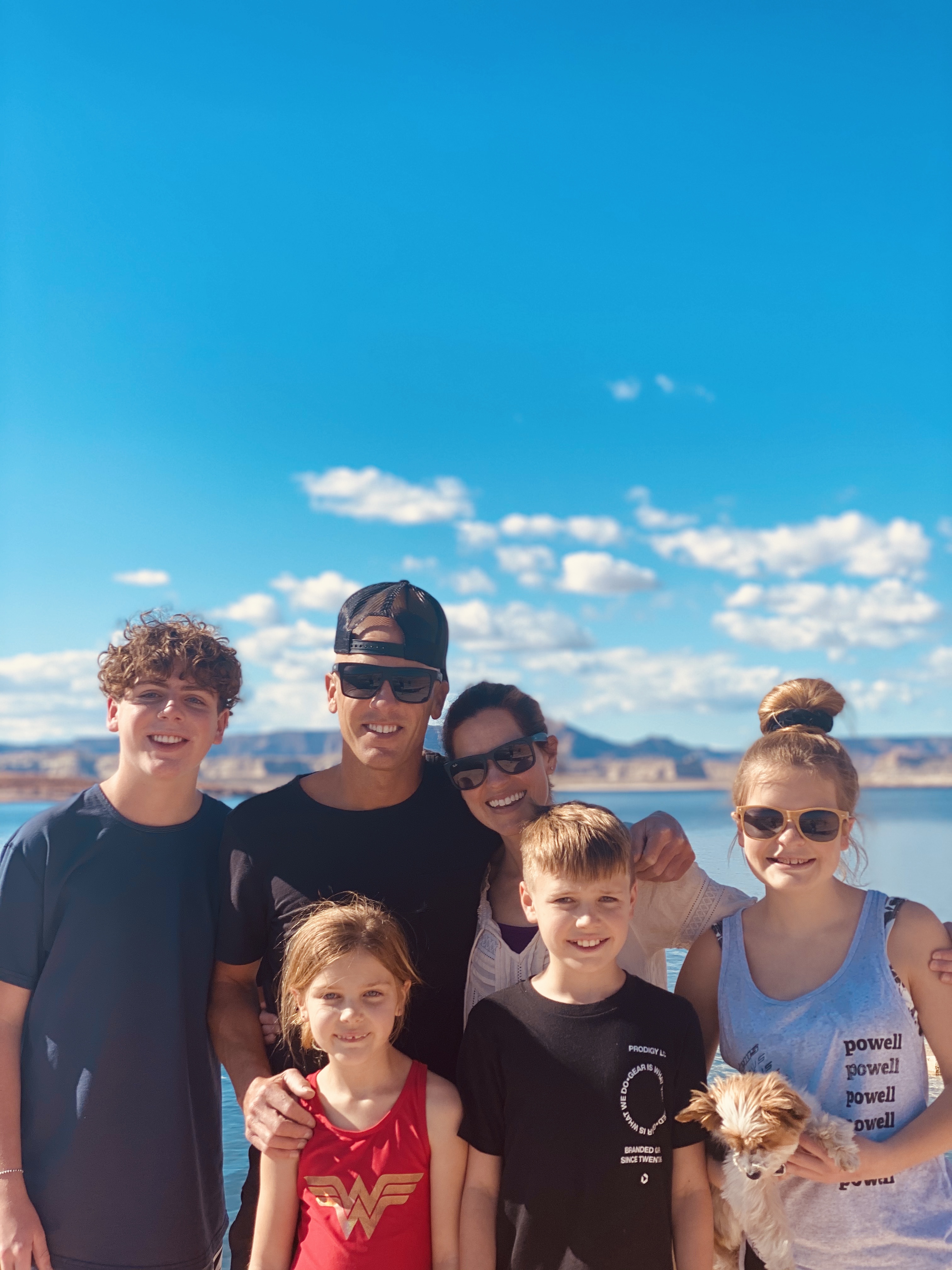 Colored pencil drawing of a family portrait: two parents, three children, and a small dog, posing outdoors near water.