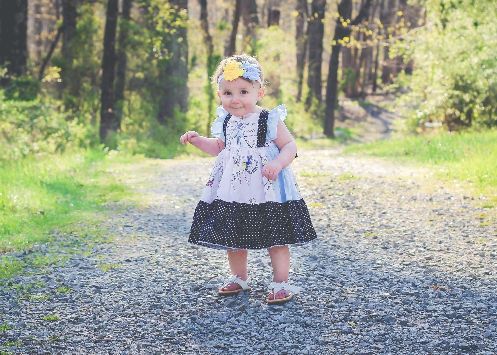 Colored pencil drawing of twin baby girls in matching dresses, outdoors in a wooded area.