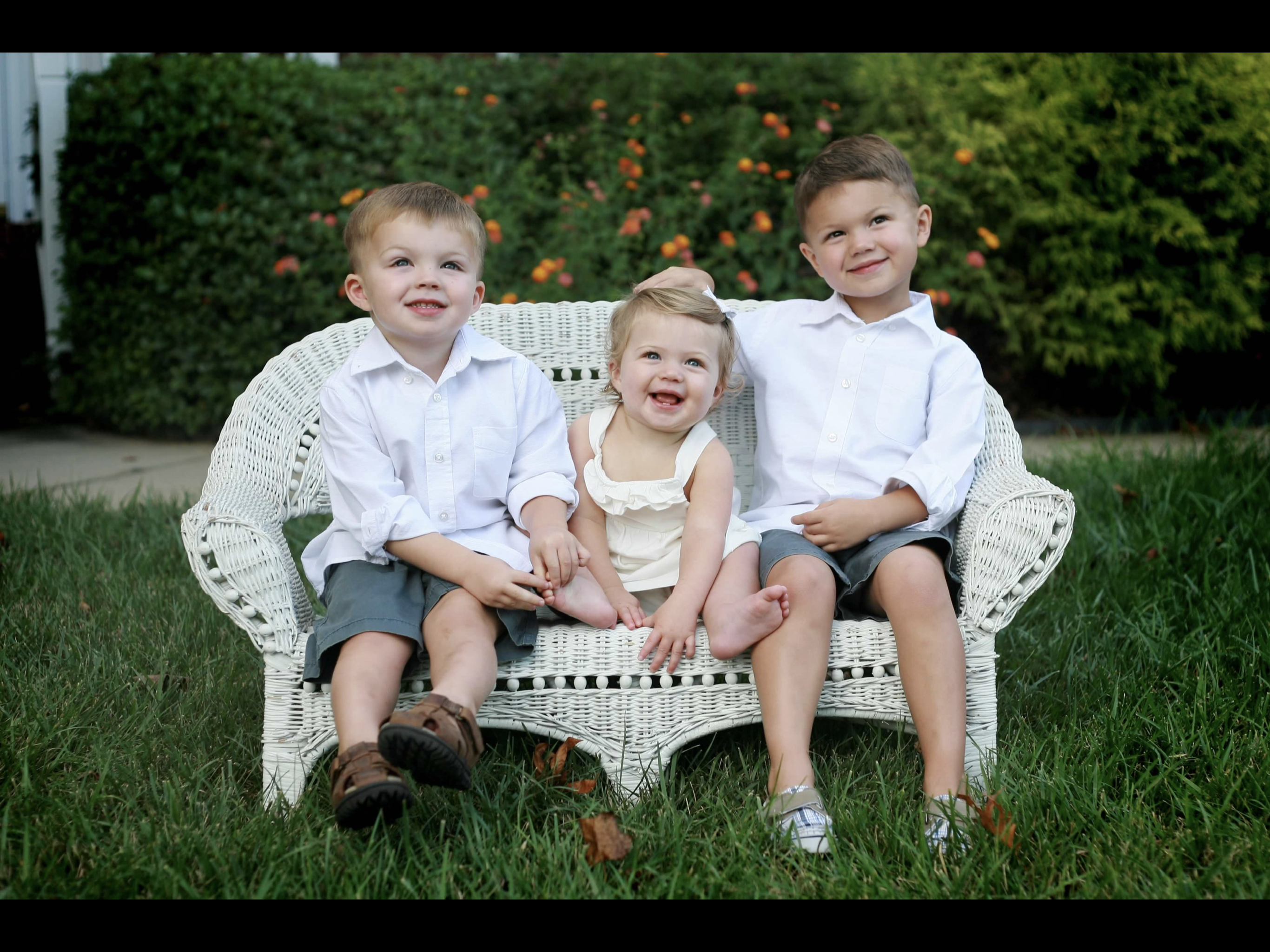 Three young children sitting on a white bench outdoors.