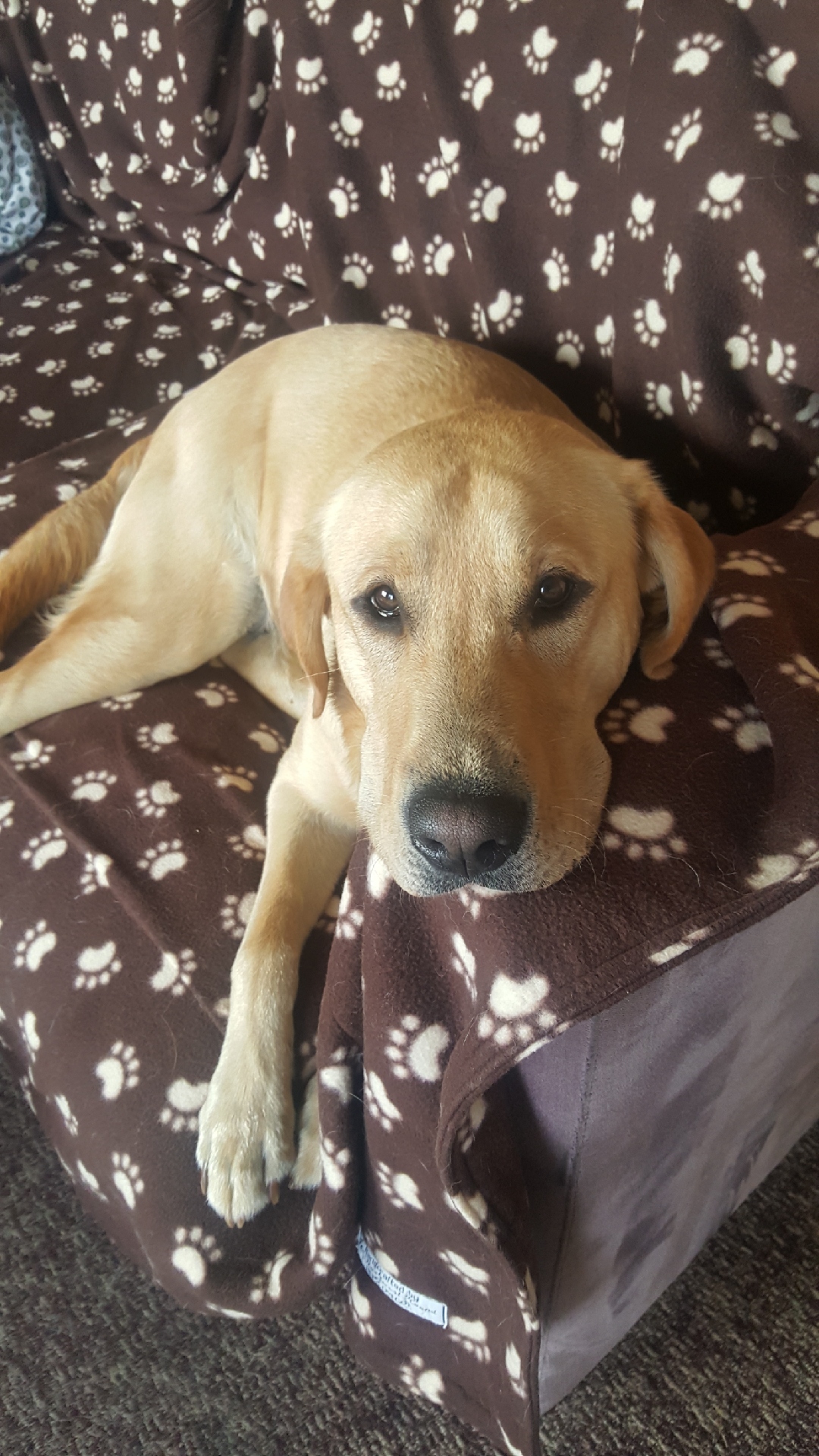 Colored pencil drawing of a yellow Labrador Retriever lying down on a brown blanket with paw prints.