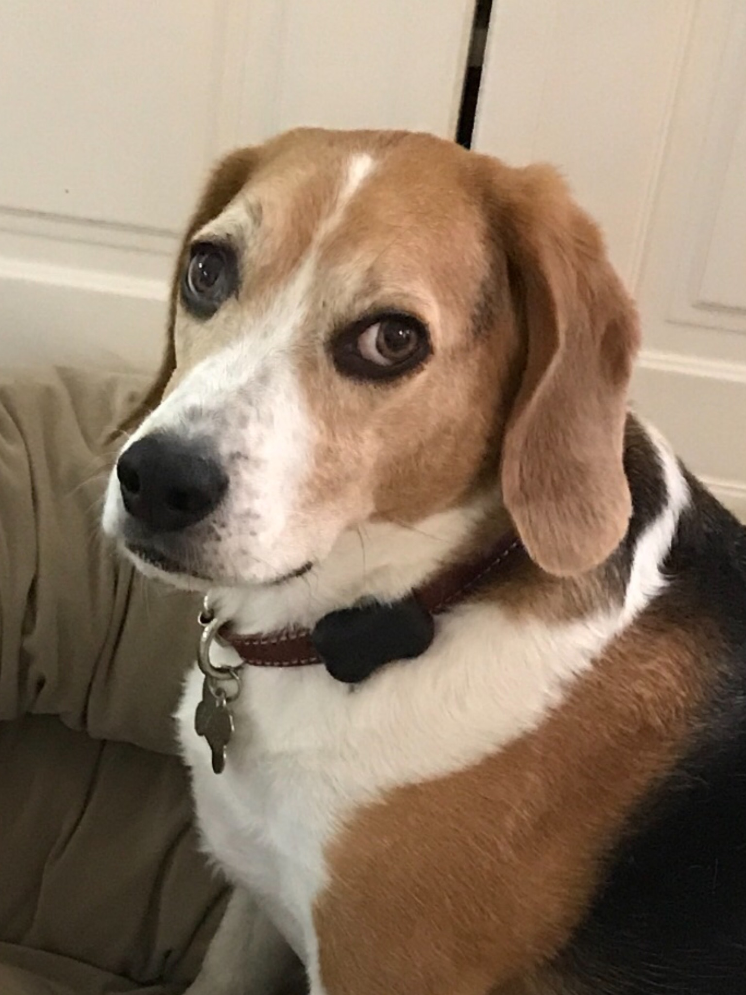 Colored pencil drawing of a beagle wearing a collar with a tag.