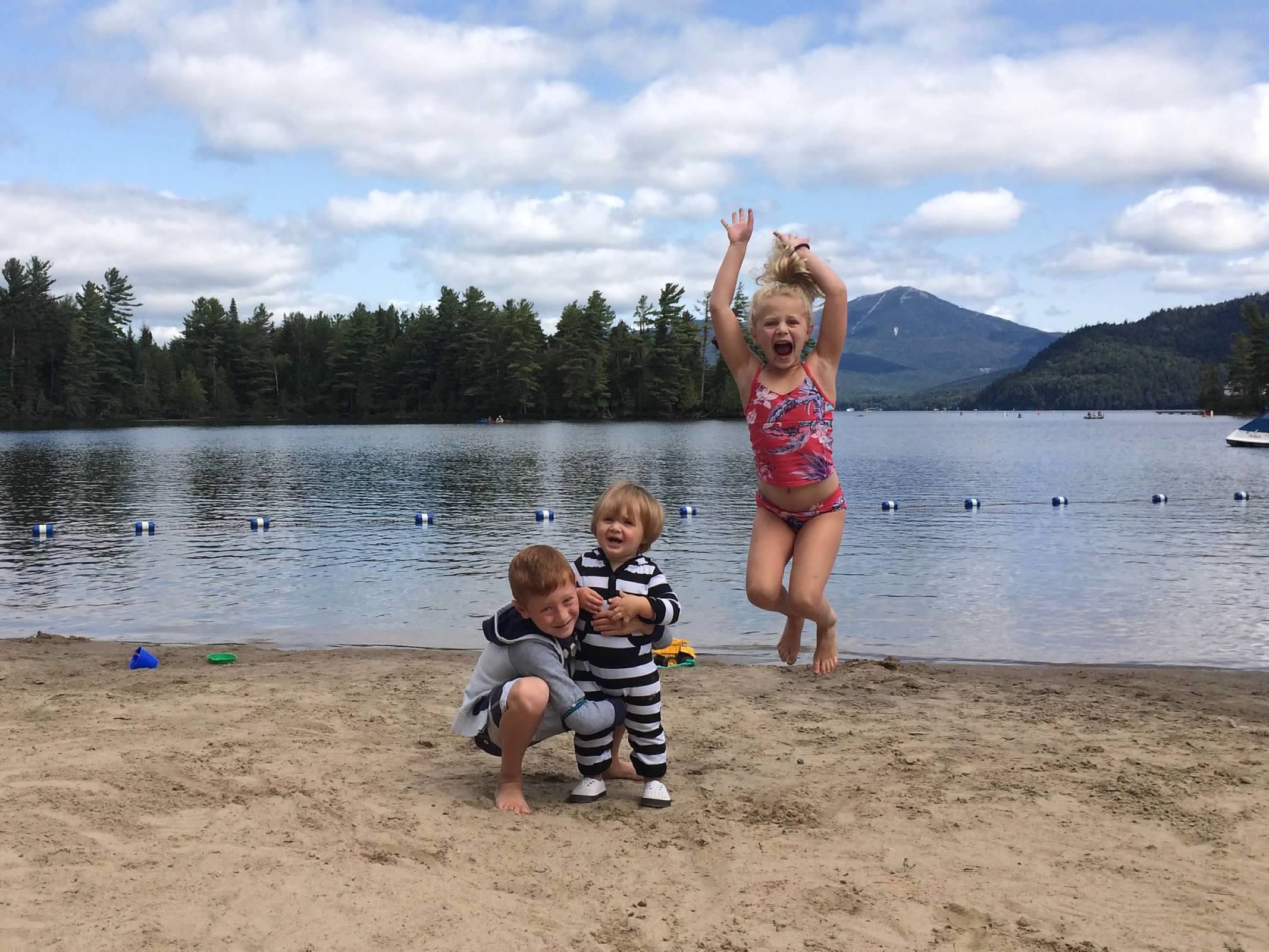 Three children playing on a sandy beach near a lake with a mountain in the background.