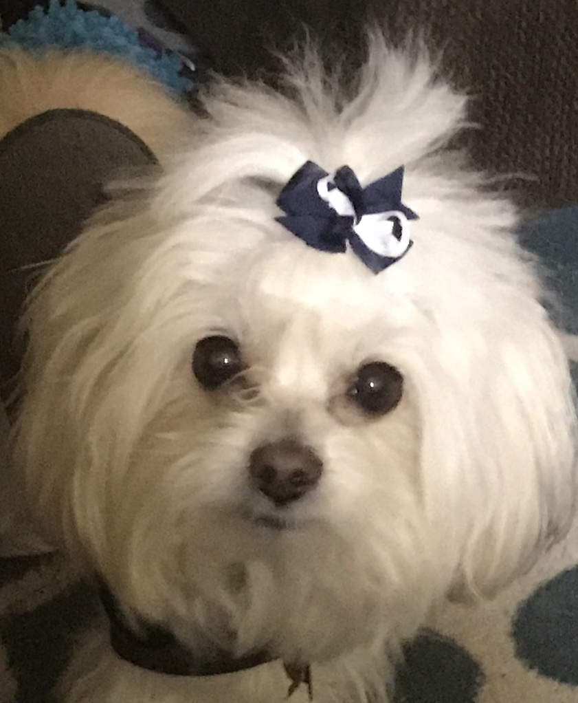 Drawing of a white dog with a pink bow.