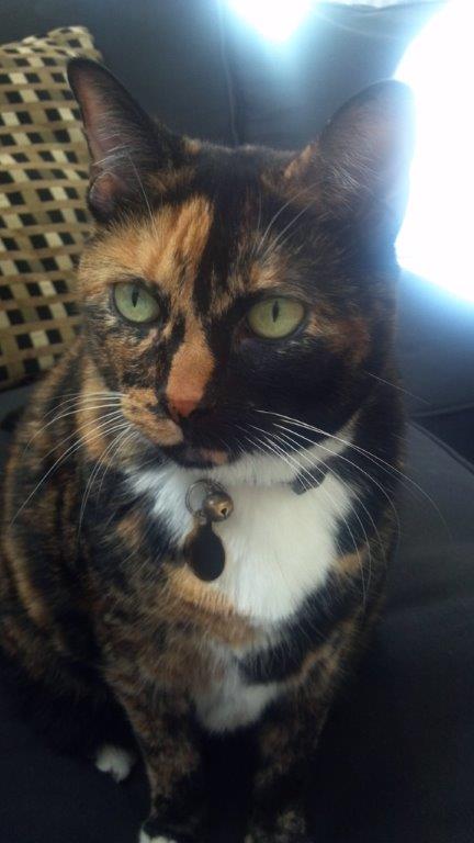 Calico cat portrait with green eyes and collar