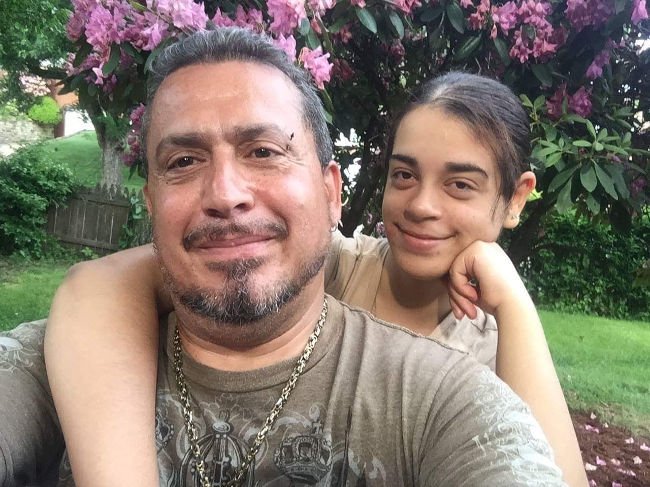 Colored pencil drawing of a man and a girl smiling, outdoors near pink flowers.