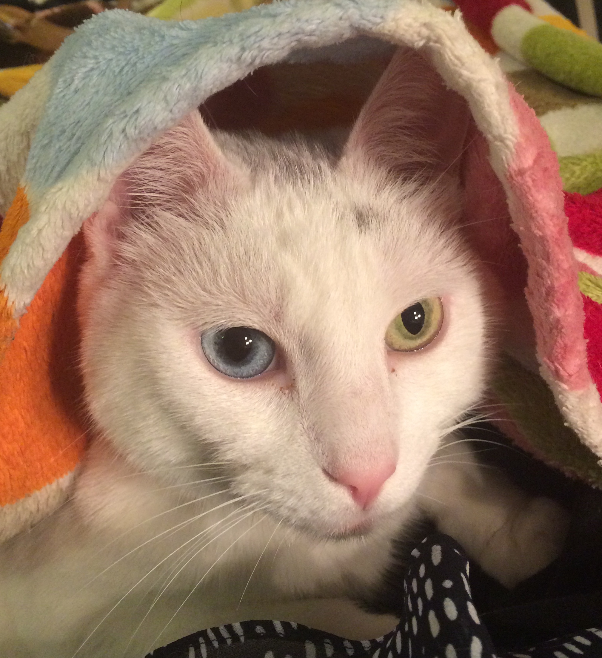 Colored pencil drawing of a white cat with different colored eyes under a blanket.