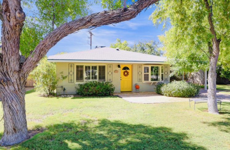 Drawing of a yellow house with a yellow door, surrounded by trees and lawn.