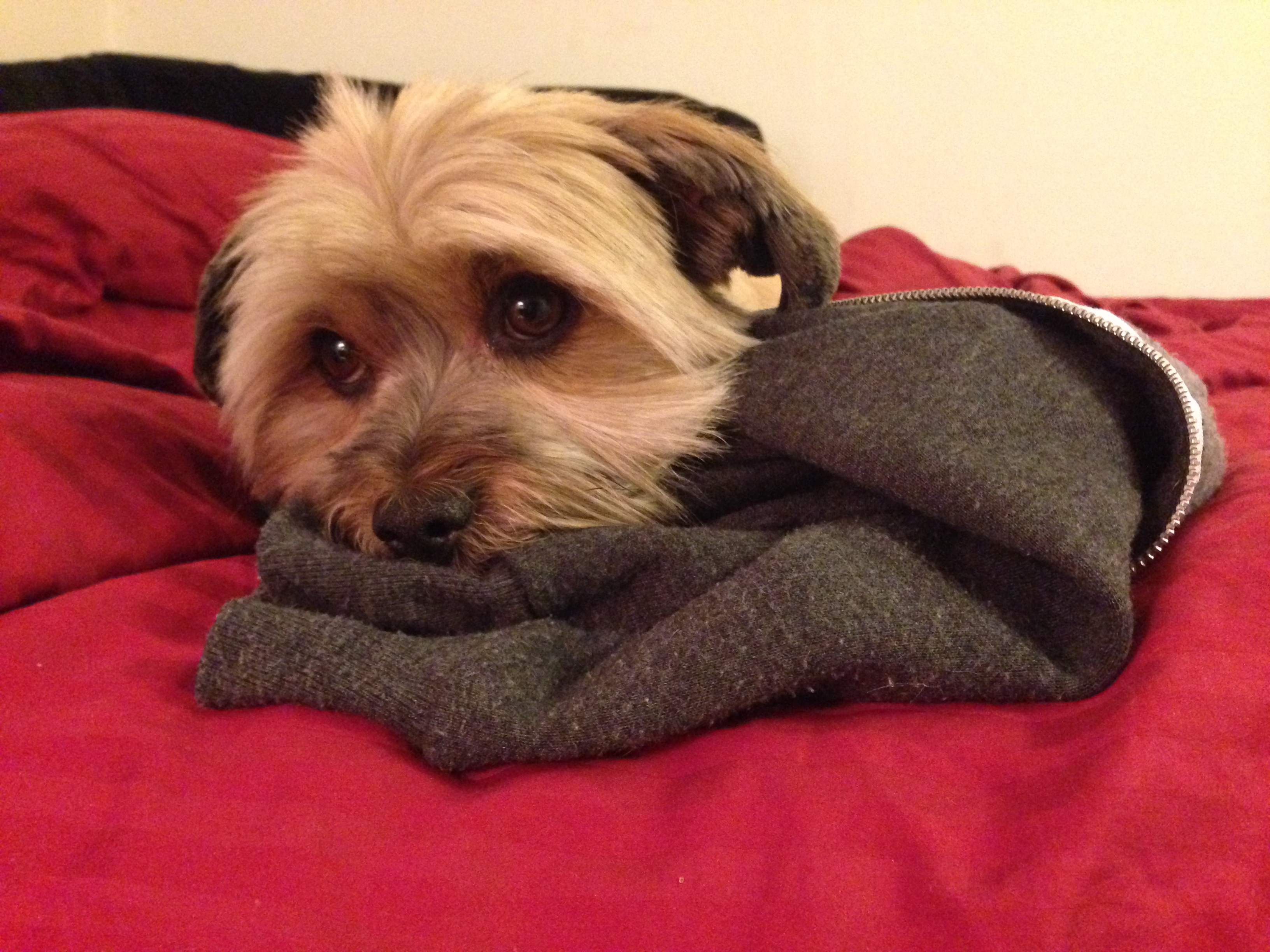 Colored pencil drawing of a small, light brown dog lying on a red surface.