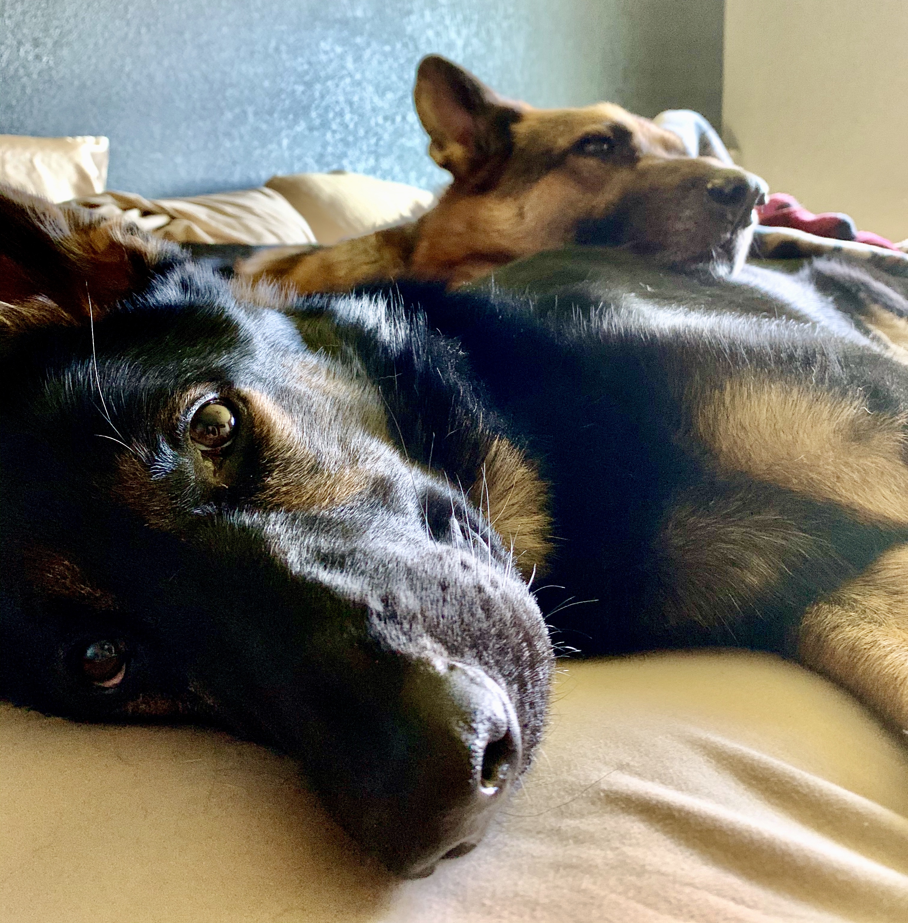 Colored pencil drawing of two dogs lying on a bed, one a German Shepherd, the other a black dog.