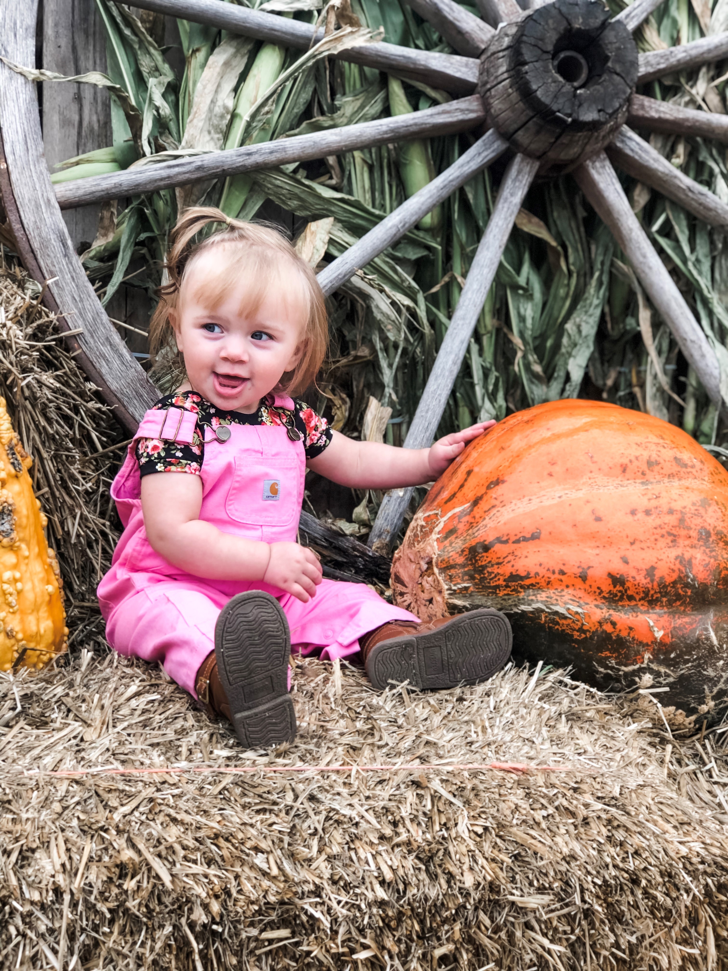 Toddler girl in pink overalls sitting with a large pumpkin near an old wagon wheel.