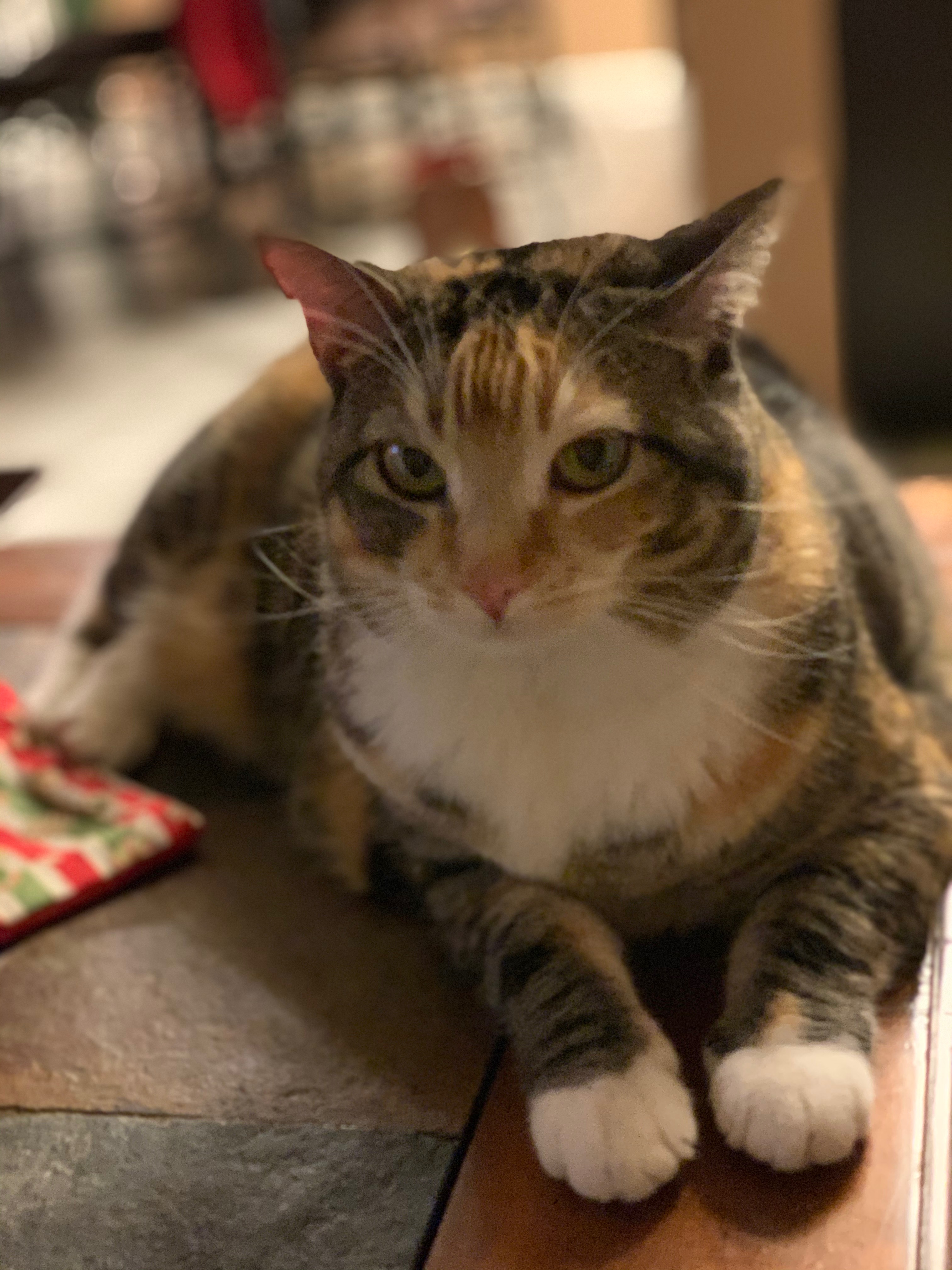Color pencil drawing of a calico cat lying down.