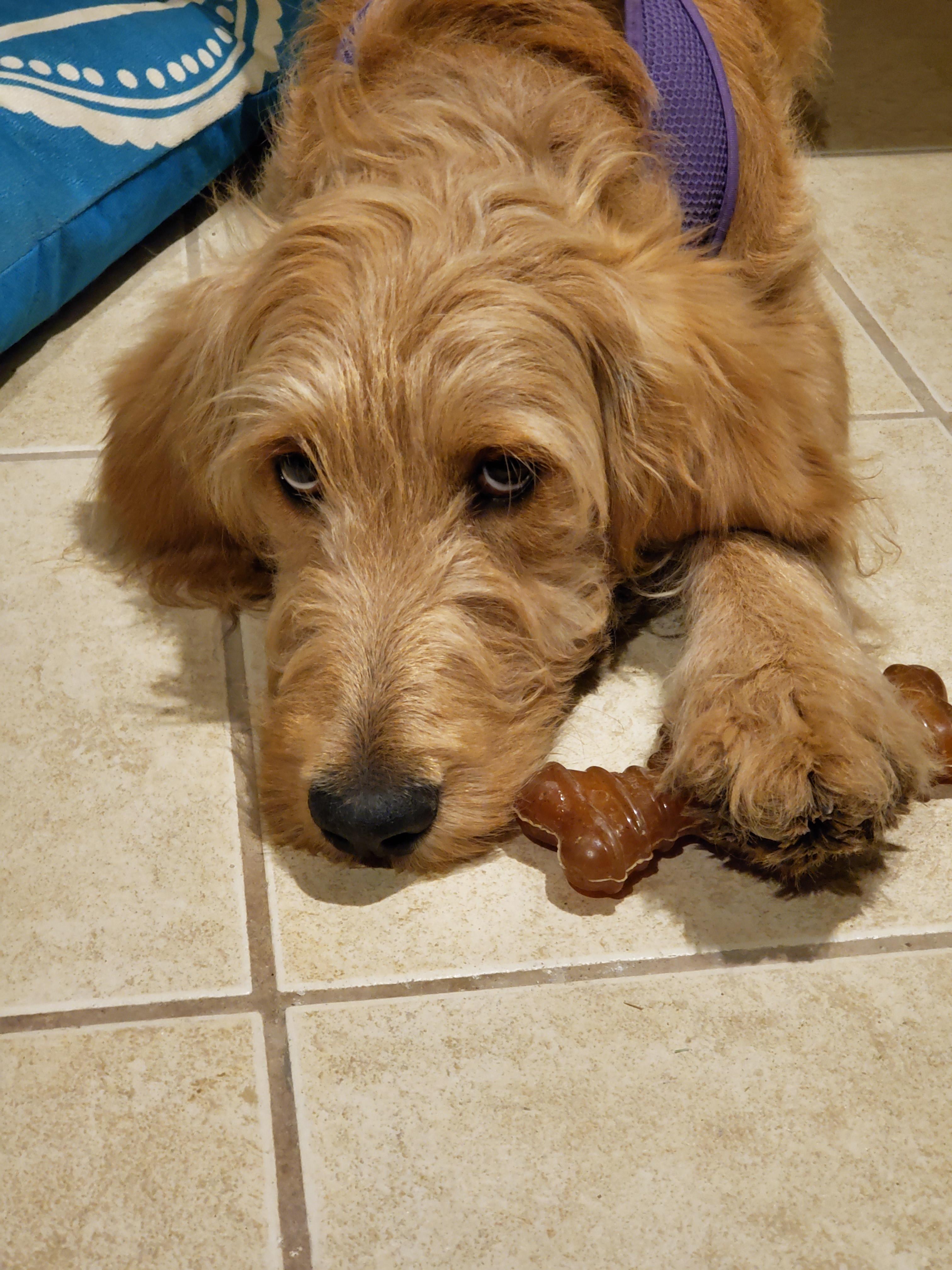 Colored pencil drawing of a light brown dog lying on a tiled floor with a dog treat.