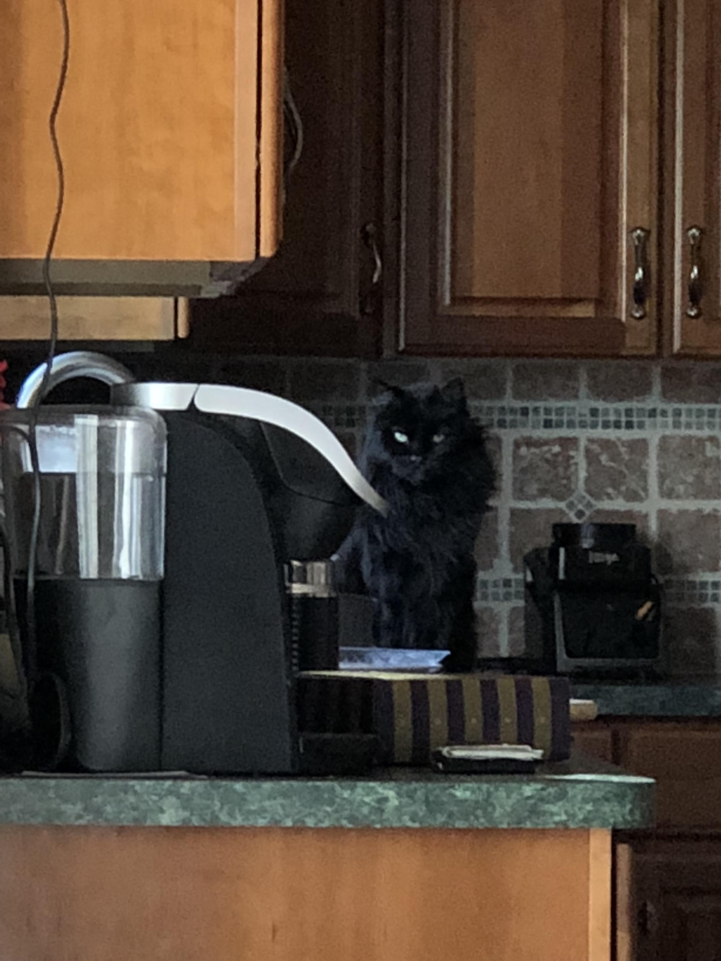 Colored pencil drawing of a long-haired black cat resting on an orange surface.