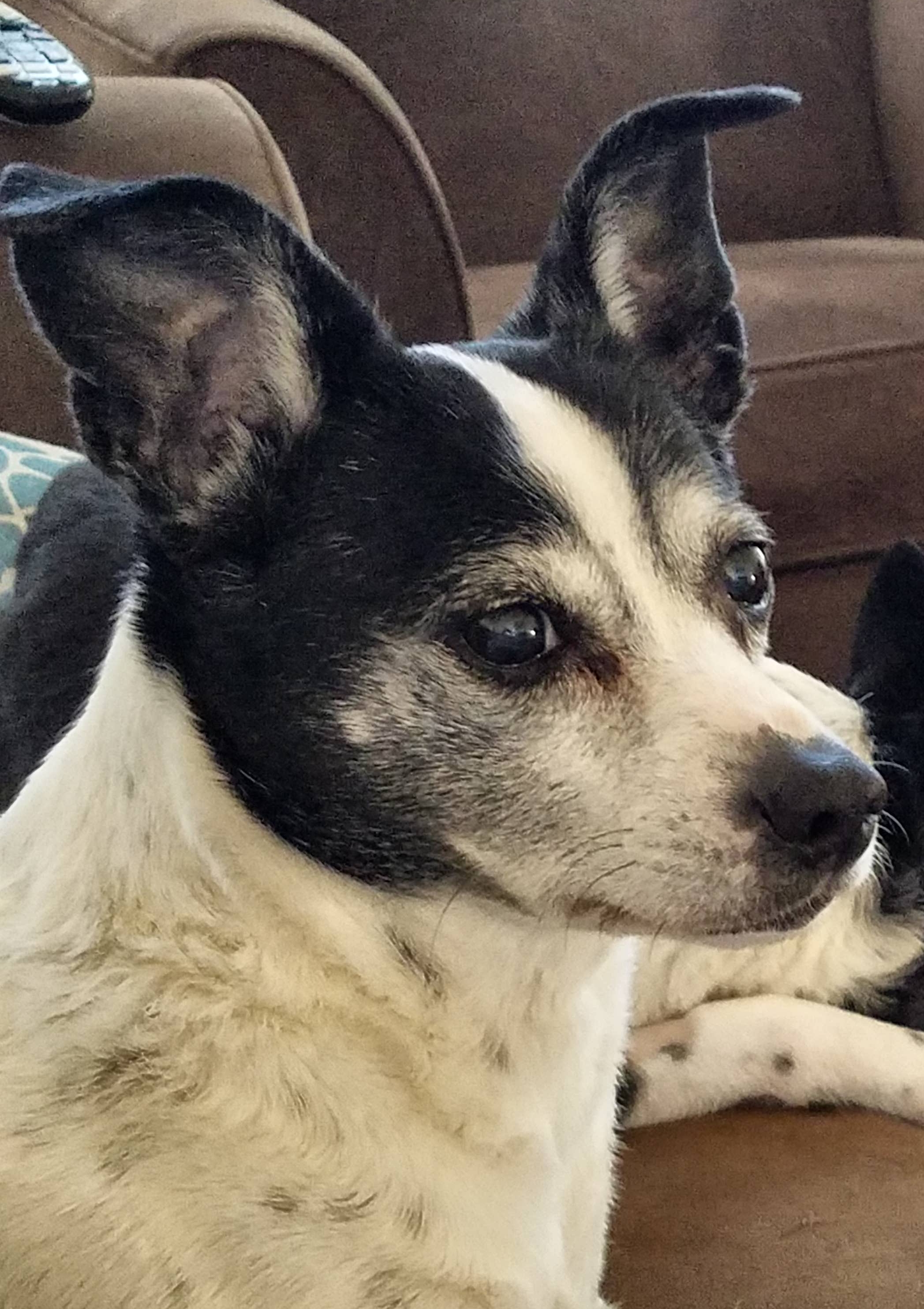 Colored pencil drawing of Molly, a small black and white dog.