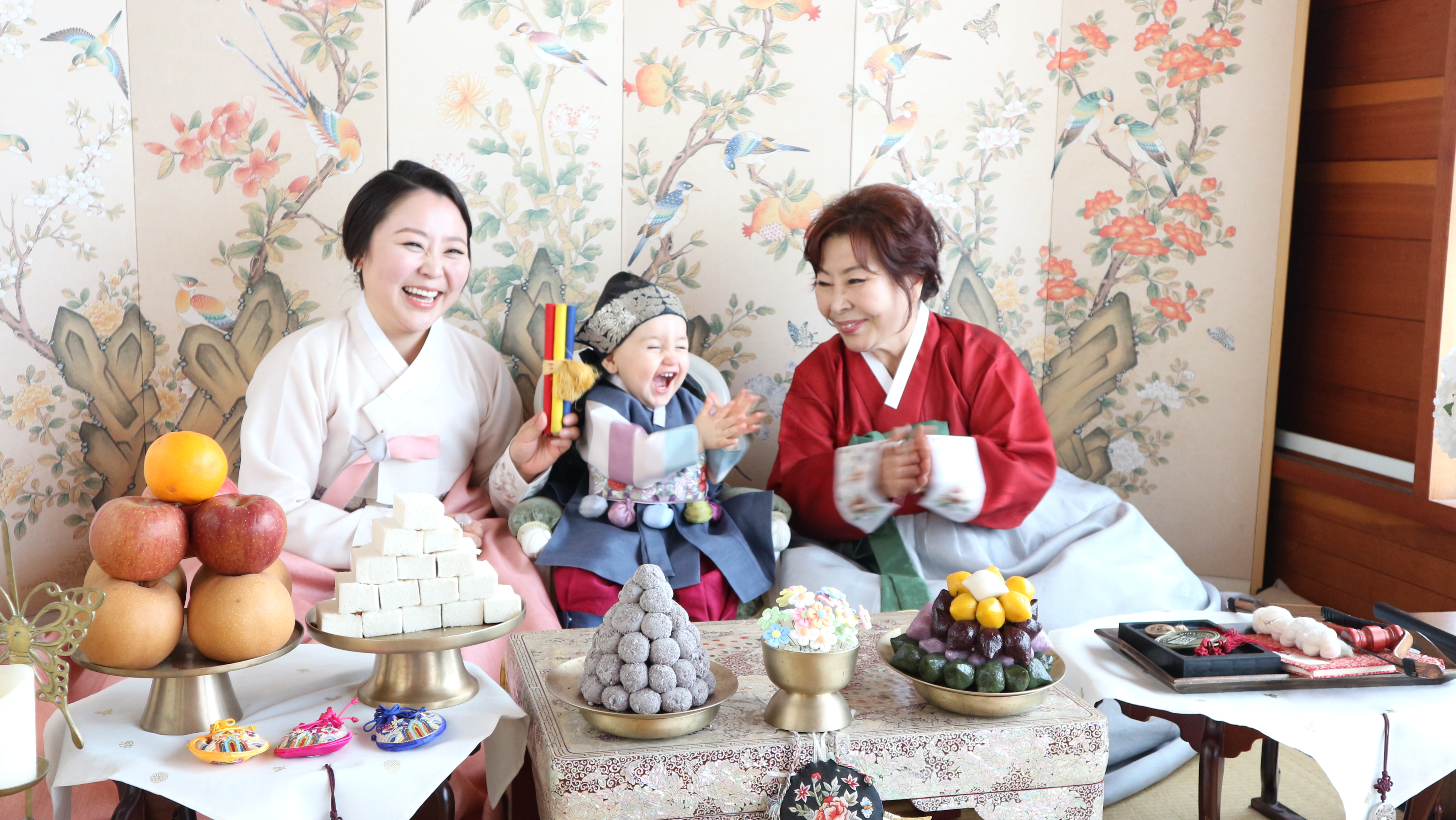 Painting of three generations of a Korean family celebrating a holiday, surrounded by traditional food and flowers.
