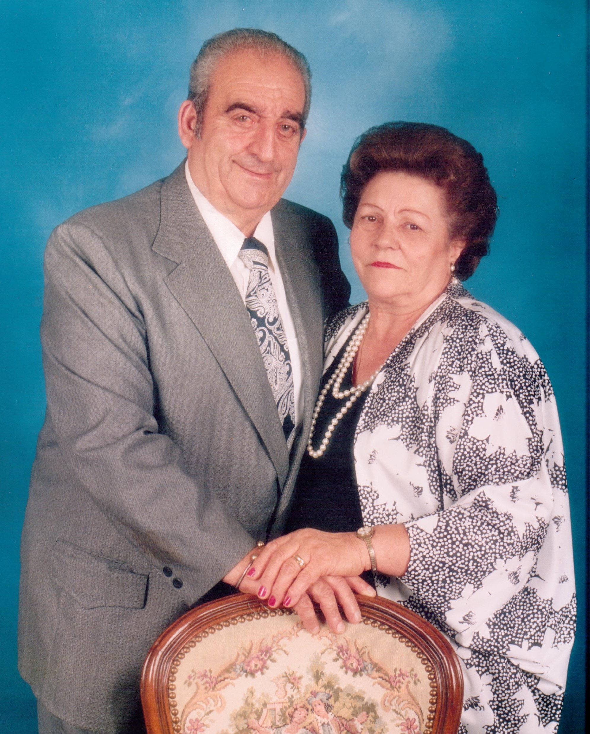 Painted portrait of five people, appearing to be a family, set against a cloudy sky.