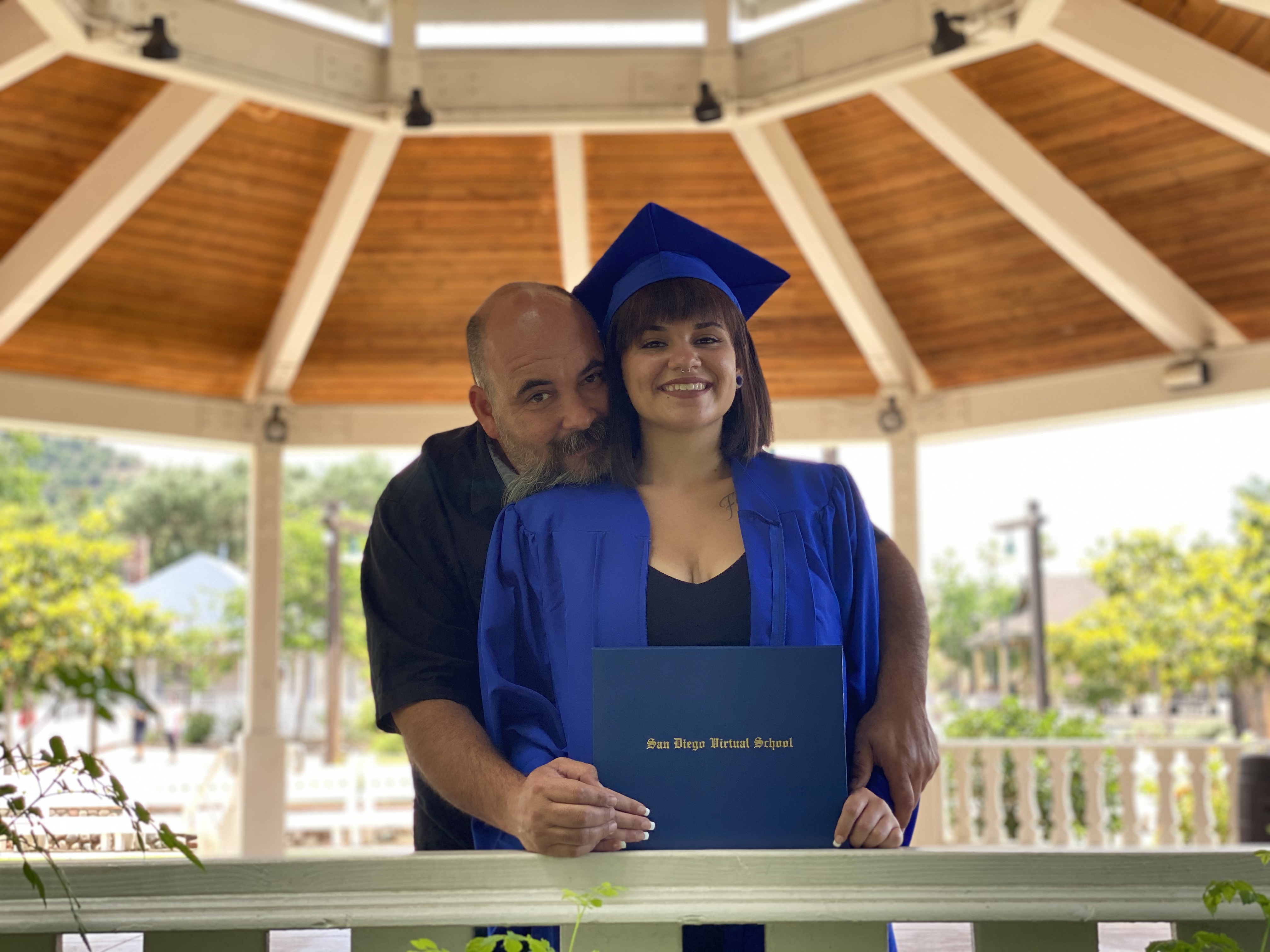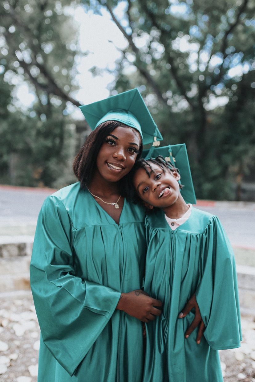 Painted portrait of a family: a graduating daughter, her younger sibling, and their father.