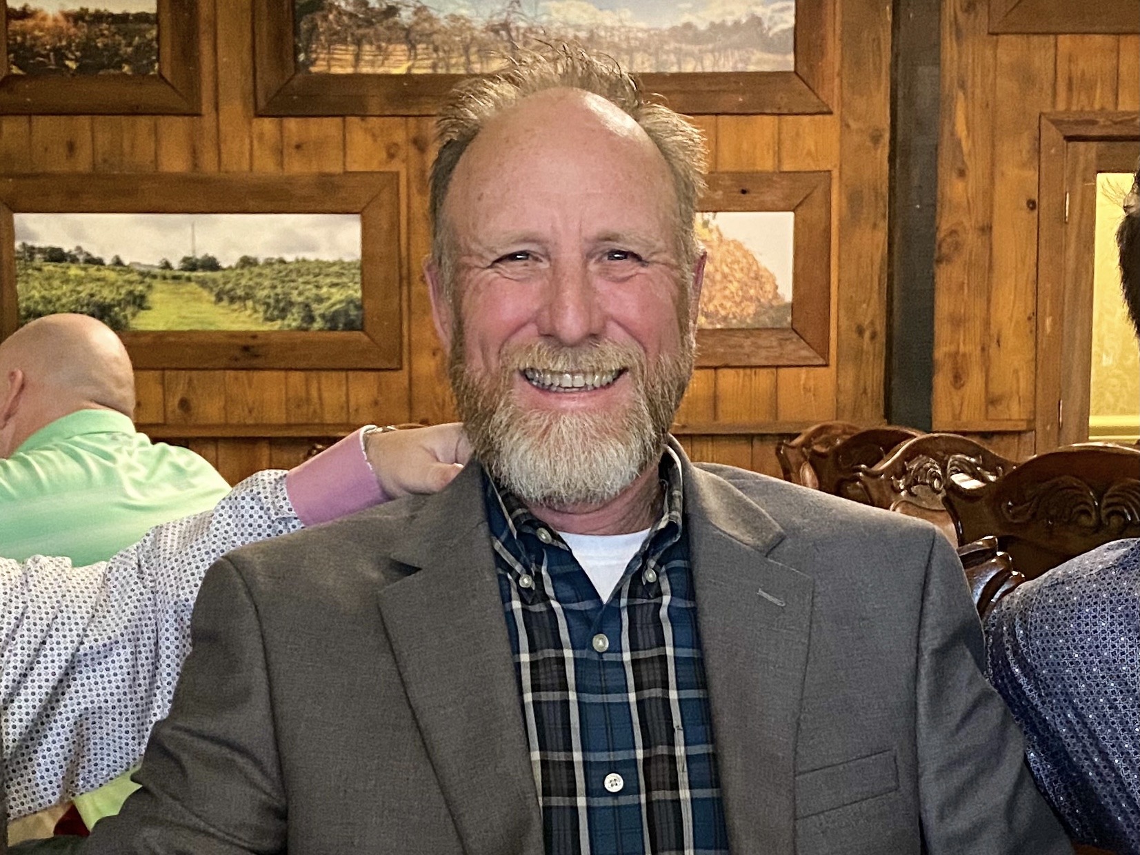 Painted portrait of four men, smiling, in suits and ties against a green background.