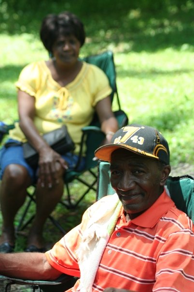 Family portrait painting of five Black people, two older adults, two younger adults, and a baby.