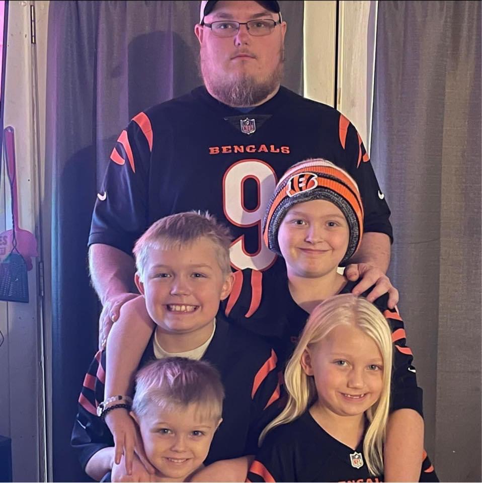 Painting of a family in Cincinnati Bengals jerseys in front of the Cincinnati skyline.
