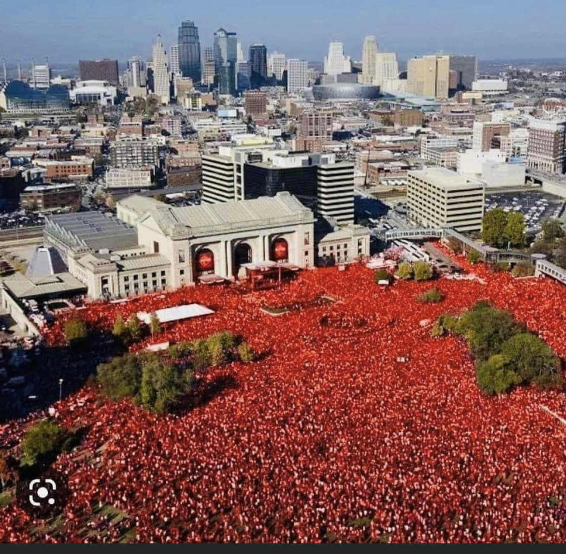 Painting of six people wearing Kansas City Chiefs sweatshirts in front of the Kansas City skyline.