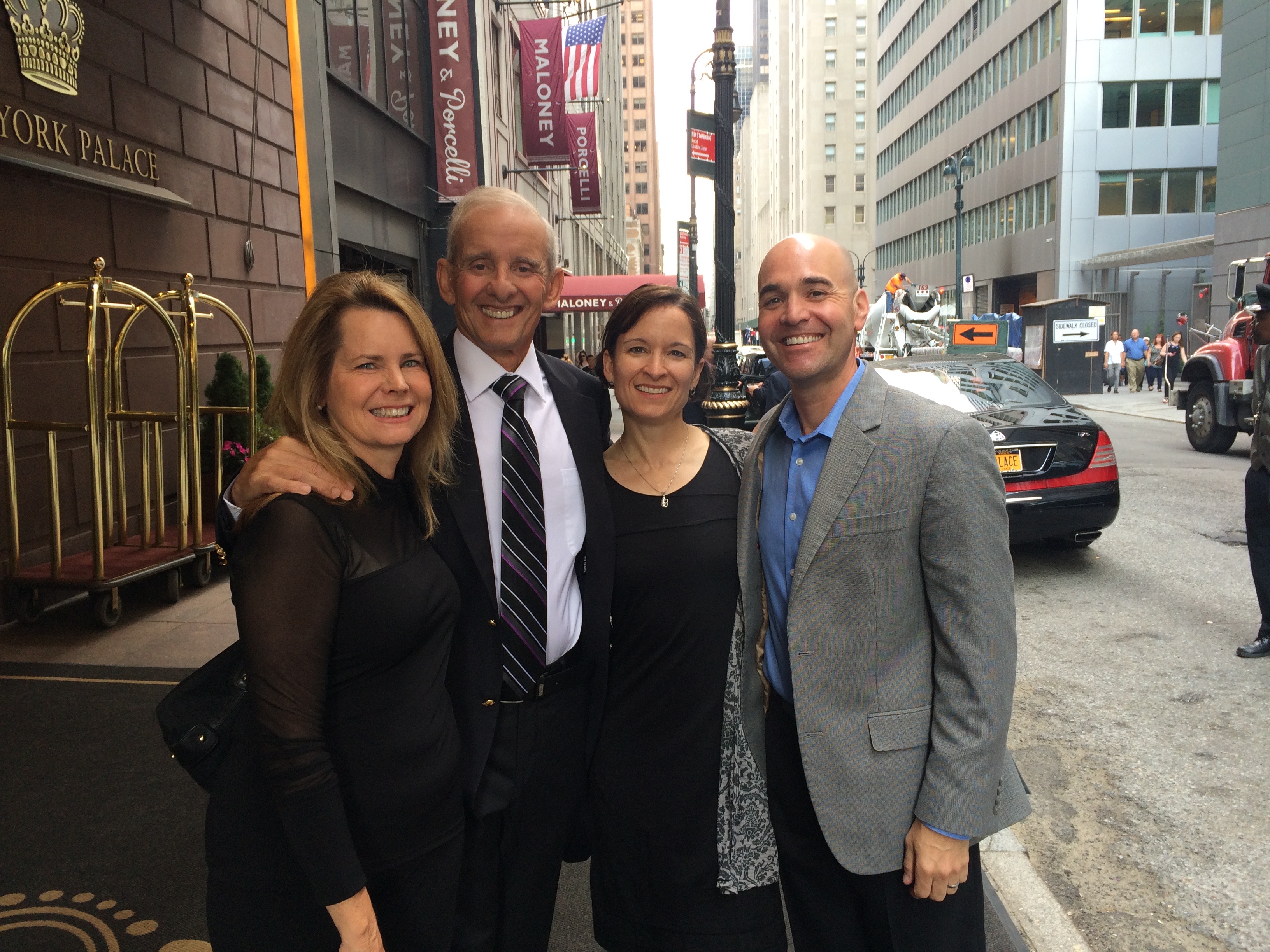 Painted portrait of a family of four in front of Chocolateria San Gines.