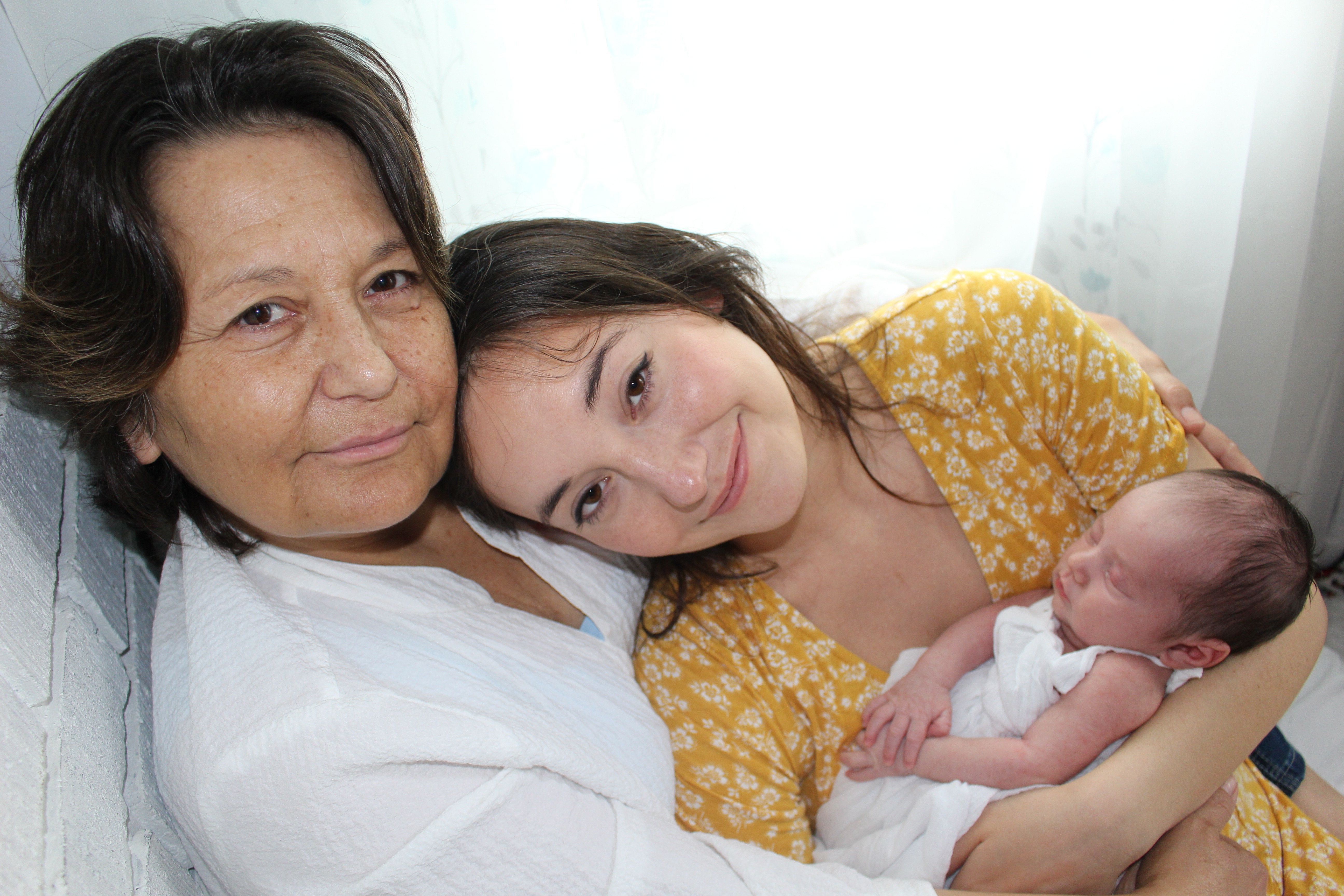 Painted portrait of three generations of women embracing, including a newborn baby.