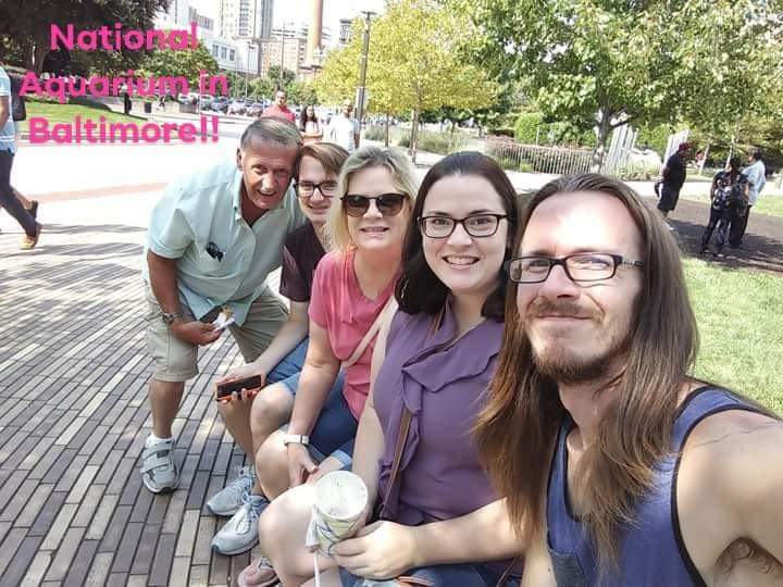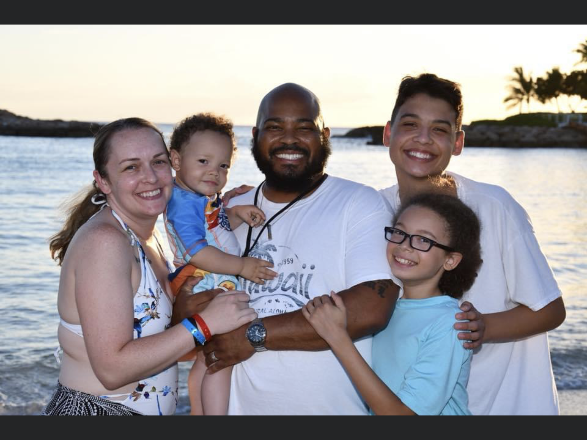 Family portrait painting, seven people smiling, outdoors.