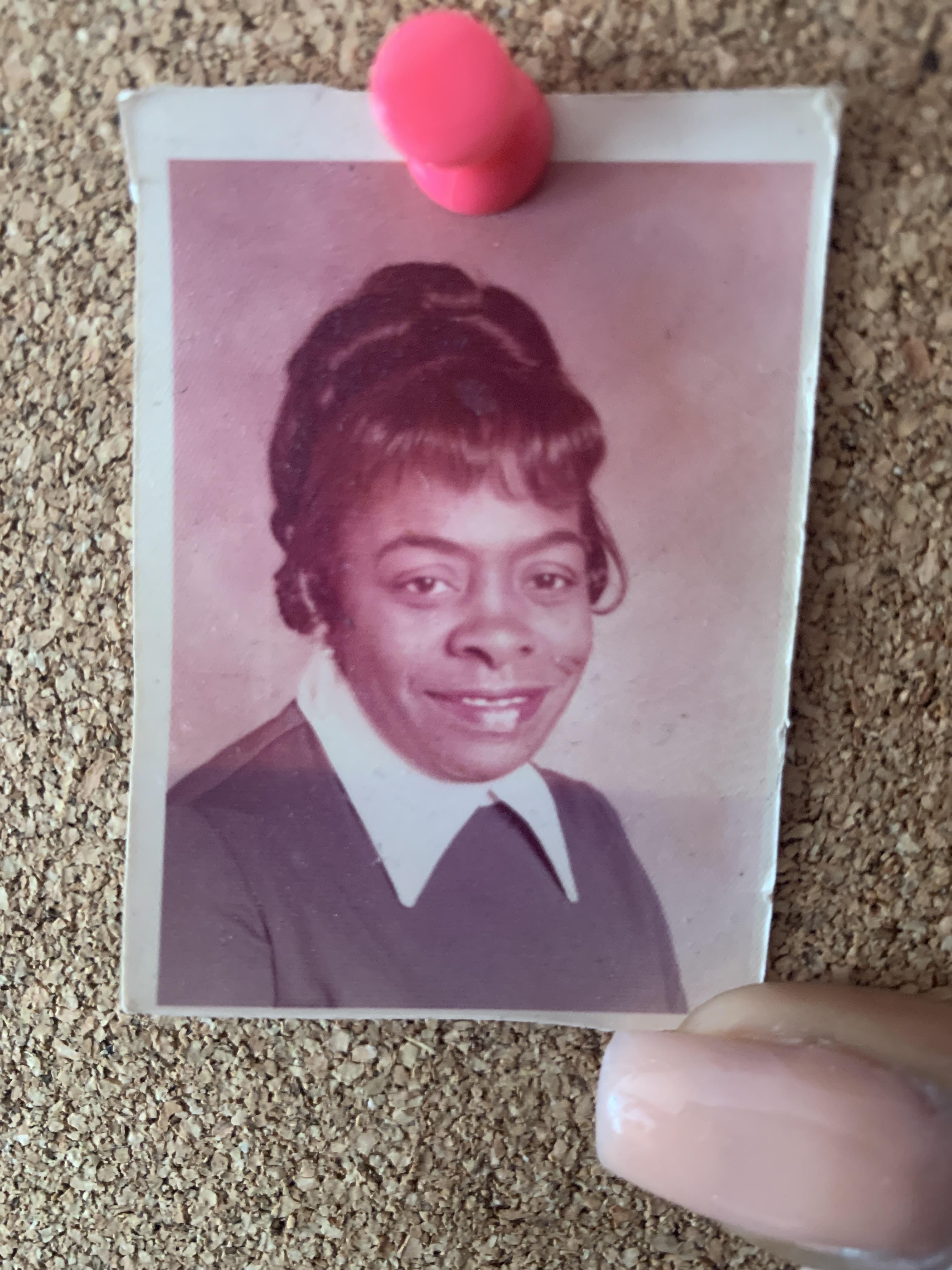 Woman pointing at family portrait.